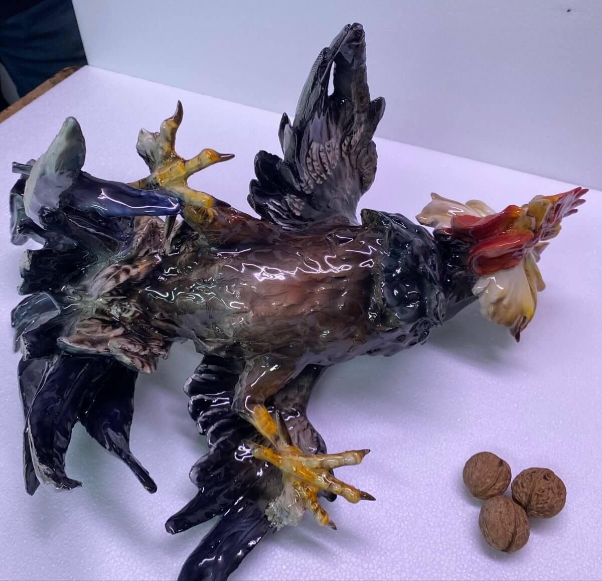 Très beau combat de coqs, plein de mouvements et avec un superbe émail . A noter : trois plumes recollées et des minimes égrenures sans gravité . Dimension du coq debout : 34 cm x 36 cm pour unr hauteur de 39 cm Dimension de l'attaquant : 27 cm x 45 cm pour une hauteur de 24 cm