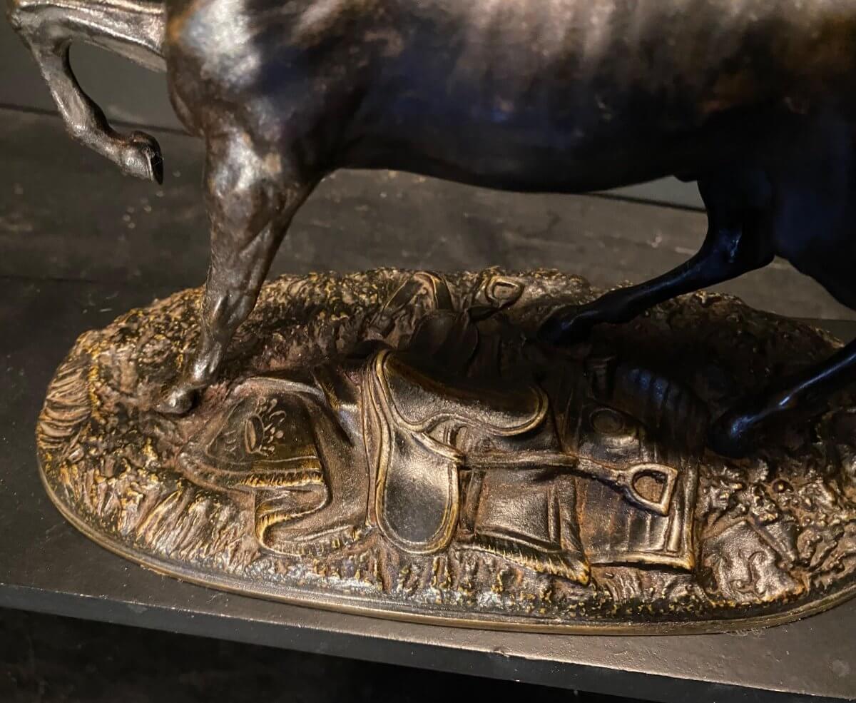 Cheval en bronze sur une terrasse ovale . Sur la terrasse, un cartouche avec les lettres PL pour P Lenordez ( 1814-1892 ) . Légére usure de la patine .