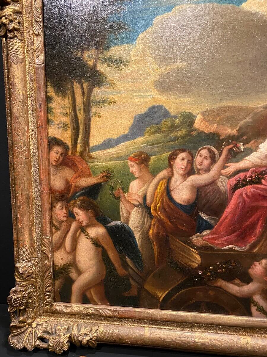 Huile sur toile représentant le triomphe de Flore, d'après Nicolas Poussin, dans son cadre d'origine . Toile en bon état avec juste une petite pièce, voir photo . Dimension du cadre : 65,2 cm x 76 cm Dimension de la toile : 54 cm x 64,8 cm