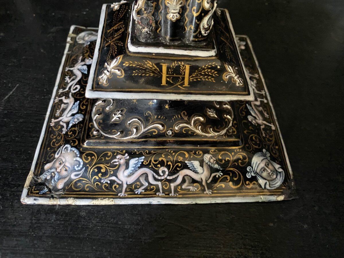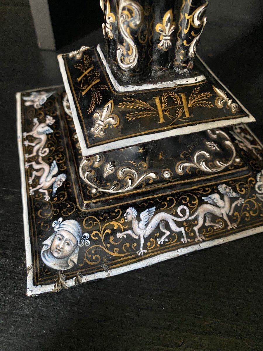 Paire de bougeoirs en émaux sur cuivre dans le gout de la renaissance .Joli décor noir, or et blanc rehaussé de rose et de bleu représentant des têtes de faunes et autres animaux mythologiques. A noter : quelques manques d'émail et petits chocs, voir les photos . 21 cm de haut . 14,5 cm x 14,5 cm dans le bas 7,5 cm x 7,5 cm dans le haut .