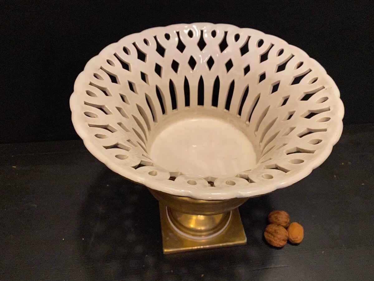Coupe ajourée en porcalaine blanche et or. Diamètre : 27,5 cm Hauteur : 27 cm