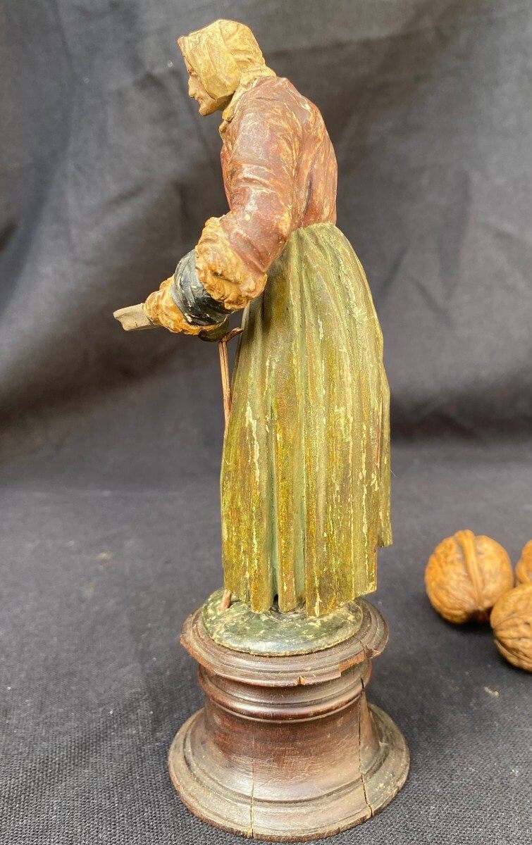 Statue de bois sculpté et polychromé représentant une femme agée tenant une assiette de sa main gauche .Son bras est recouvert d'un manchon . Elle s'appuie sur un bâton de sa main droite . Petits éclats et manques, voir photos . Diamètre : 6,5 cm Hauteur : 18,8 cm dont 4 cm pour le socle