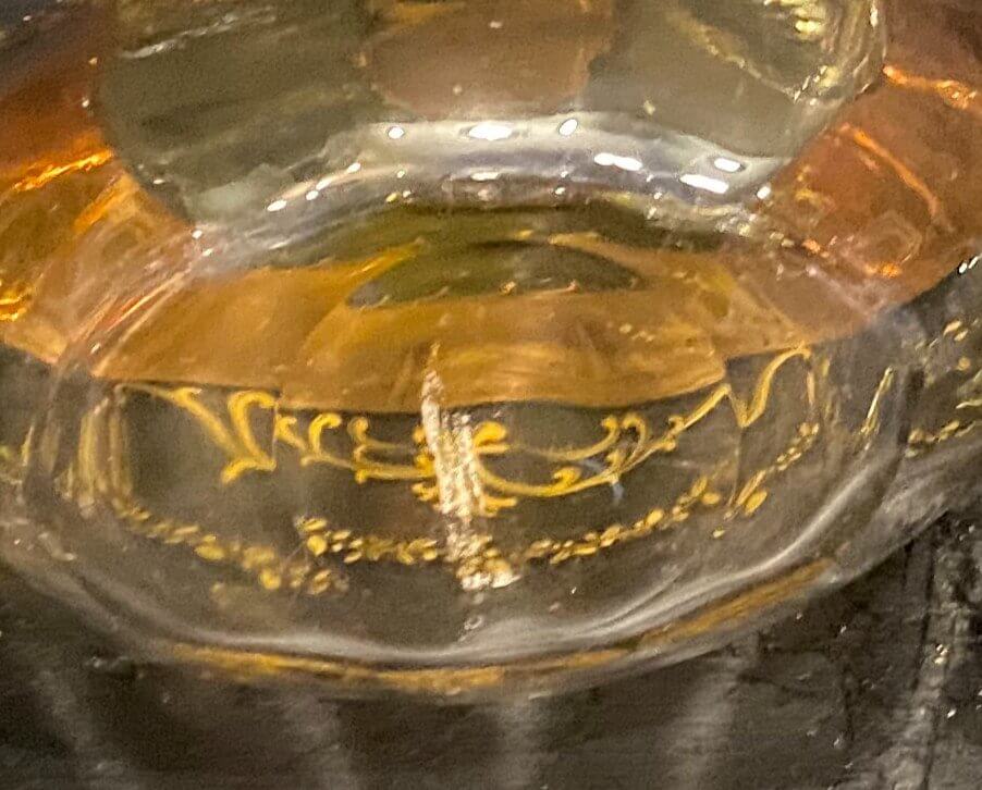 paire de carafes en cristal transparent et jaune à décor or en relief . Diamètre : 14 cm x 7,5 cm Hauteur : 25 cm