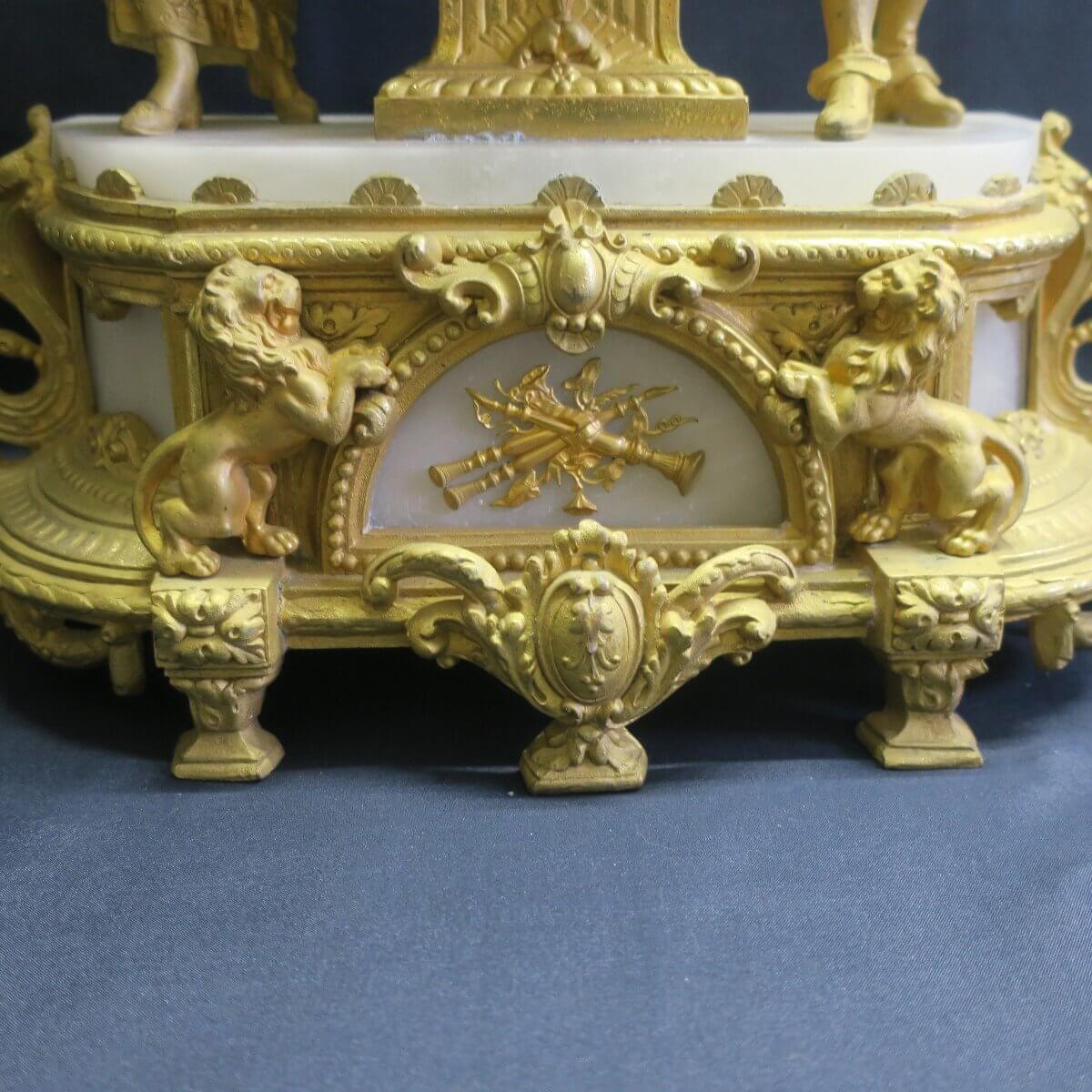 Pendule en régule doré et marbre blanc . Etat de fonctionnement Dimensions : 41 cm x 15 cm pour une hauteur de 45 cm