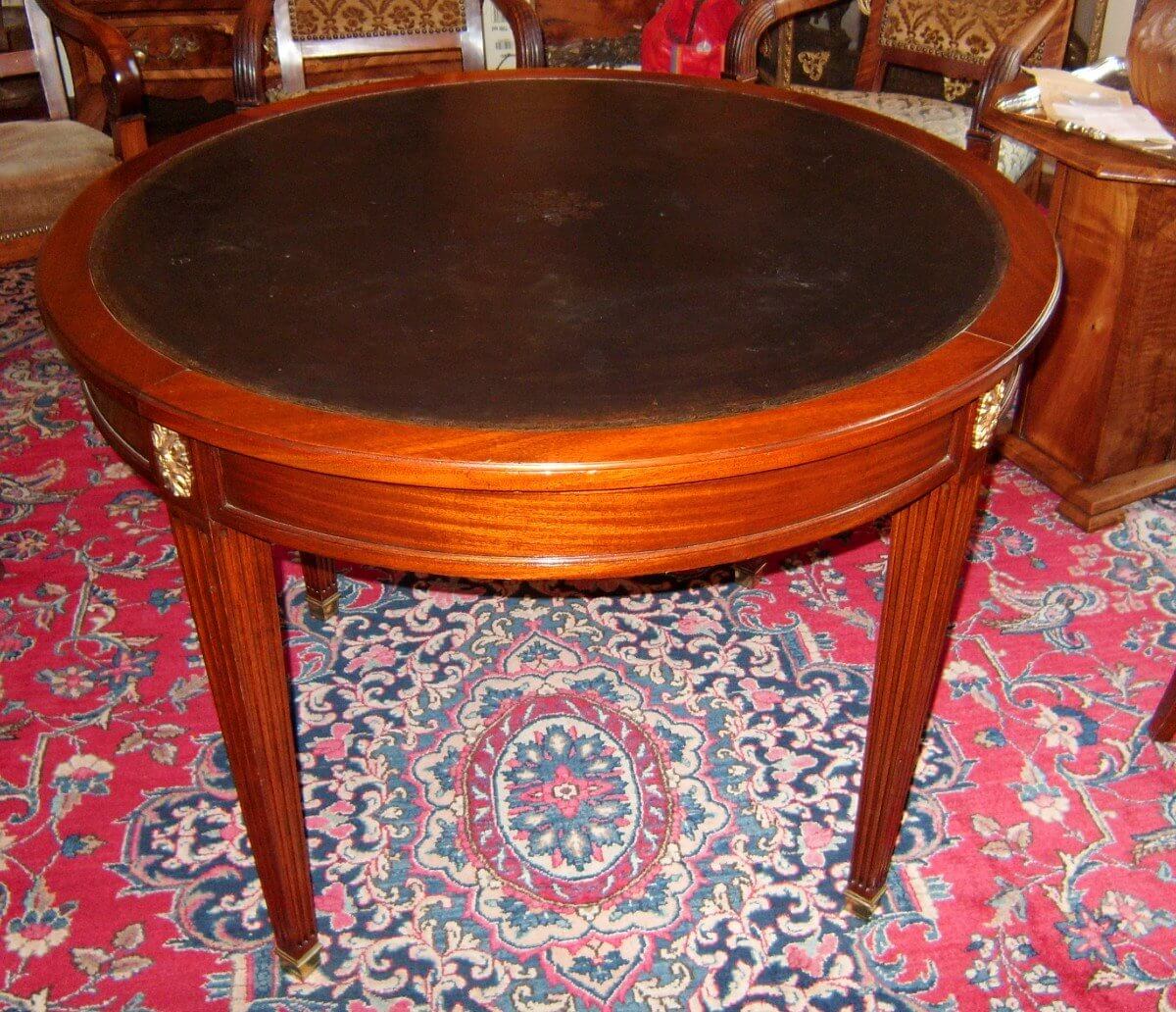 Guéridon de style Louis XVI reposant sur quatre pieds . Dessus de cuir noir d'origine . Diamètre : 100 cm Hauteur : 74 cm, 62 cm sous la ceinture