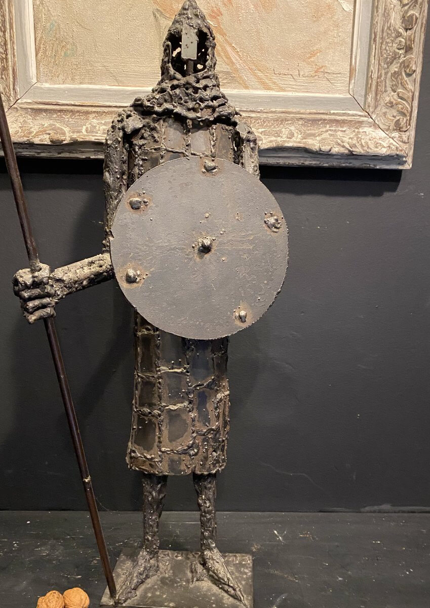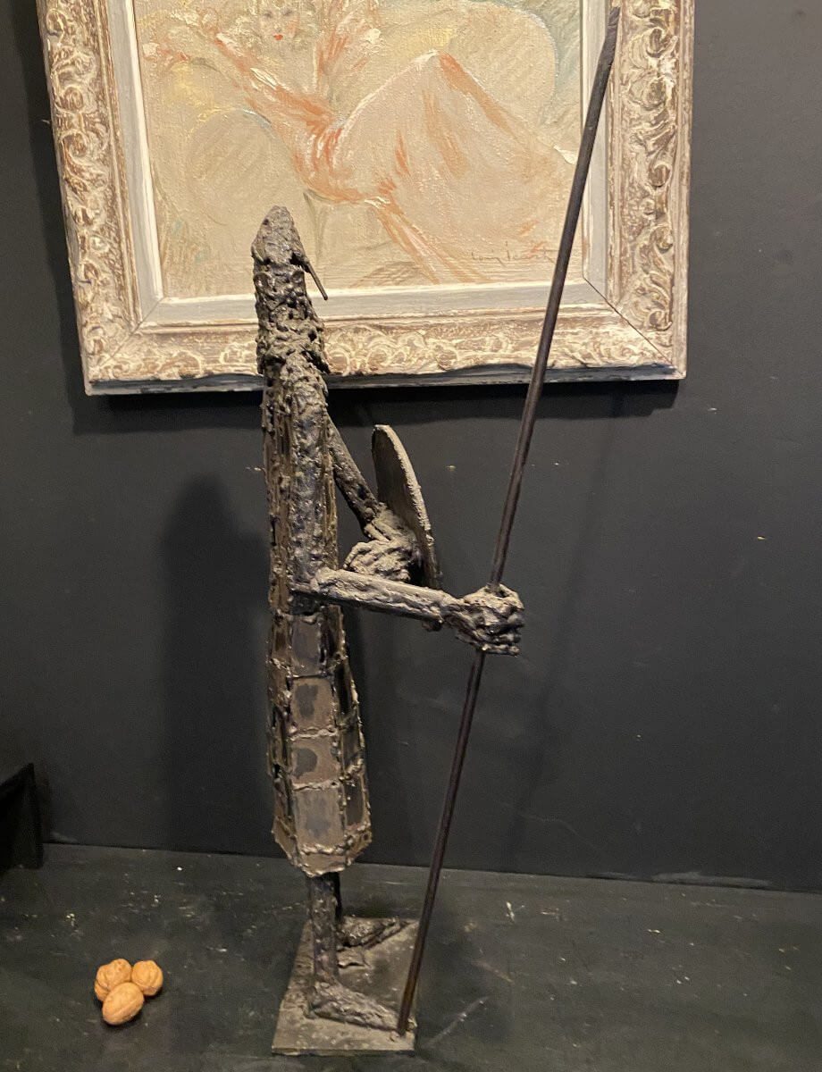 sculpture en fer représentant un chevalier, signée Pierre Clavaret.Dimension : 17,2 cm x 11,2 cm pour une hauteur de 65,5 cm