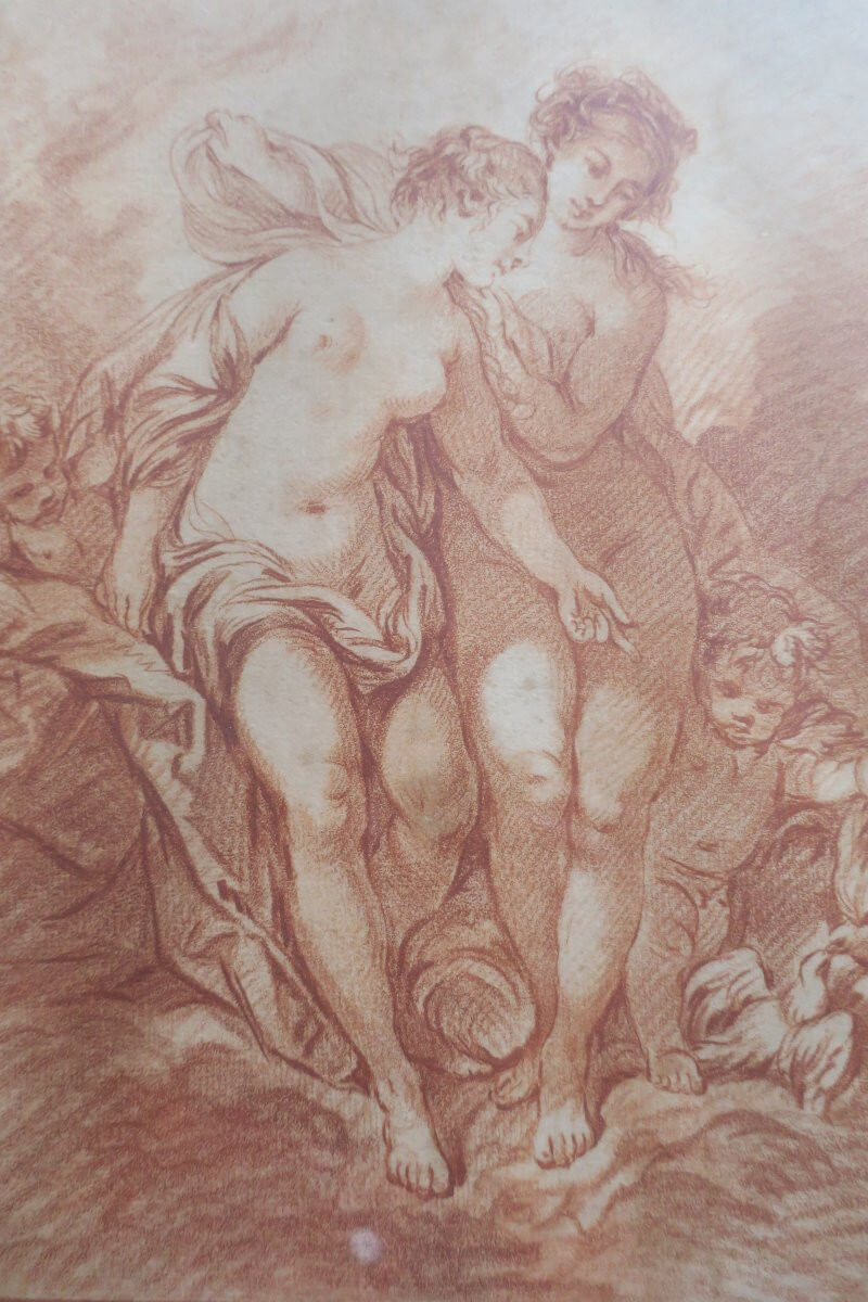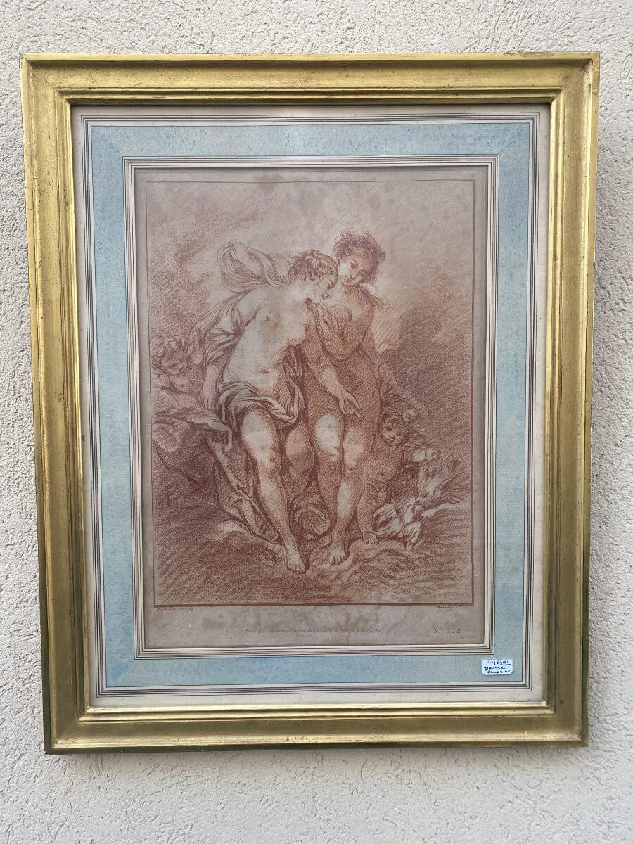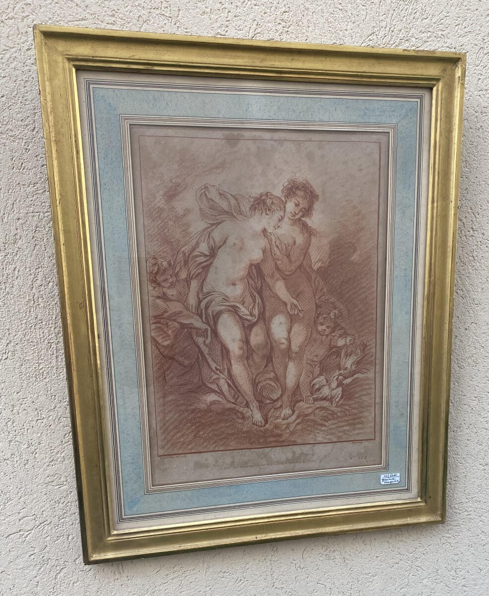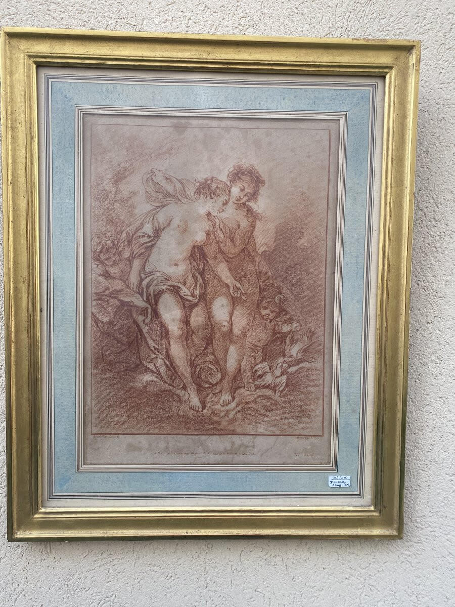 Sanguine du XVIII° siècle représentant Vénus au bain .Porte en bas l'inscription :Boucher inv det 1769n° 204 DemarteauA Paris chez Demarteau, graveur du roi, rue de la pelterie à la clocheEncadrement de bois doré ancien .Dimensions : 48 cm x 38,5 cm