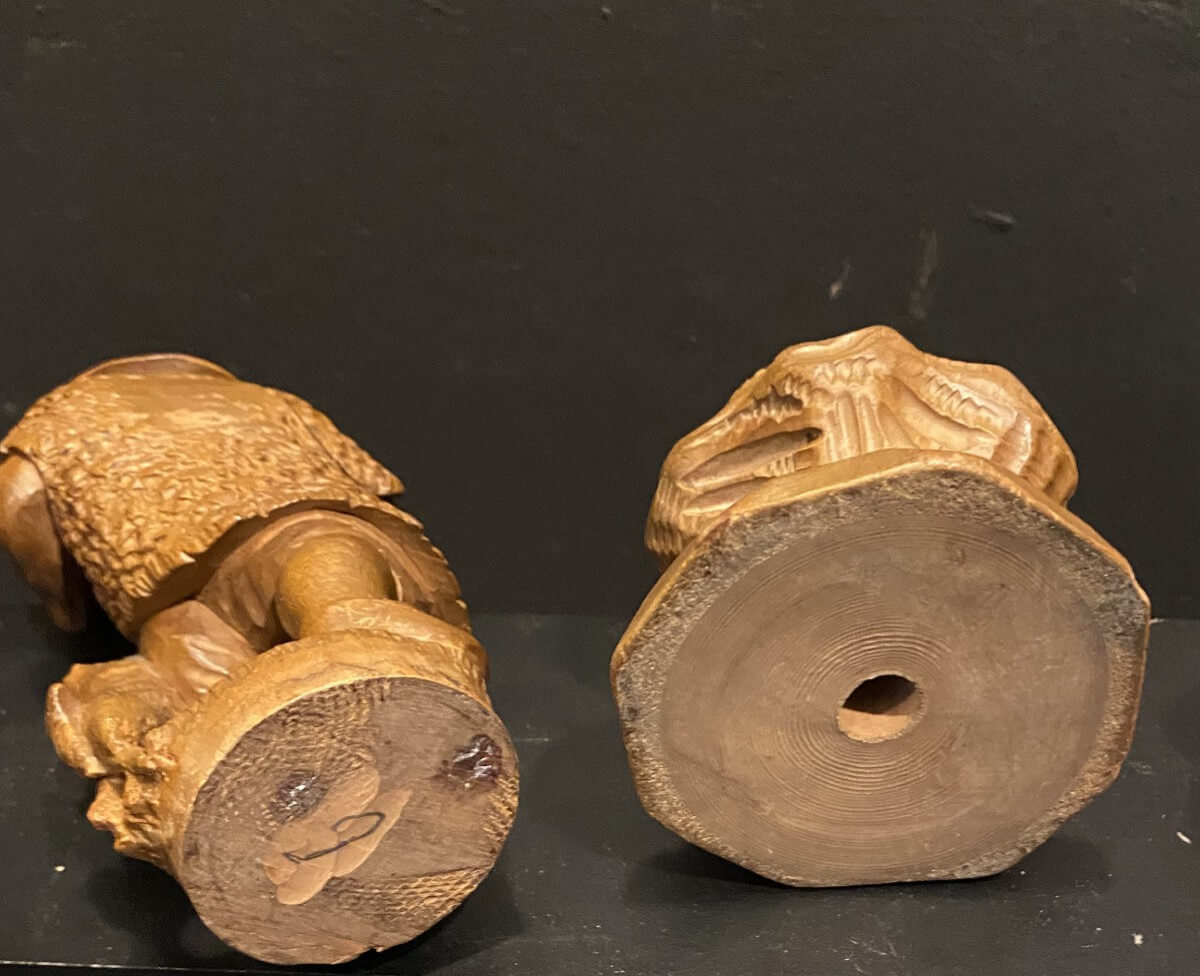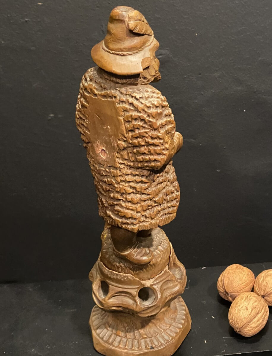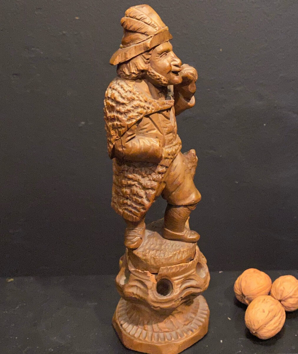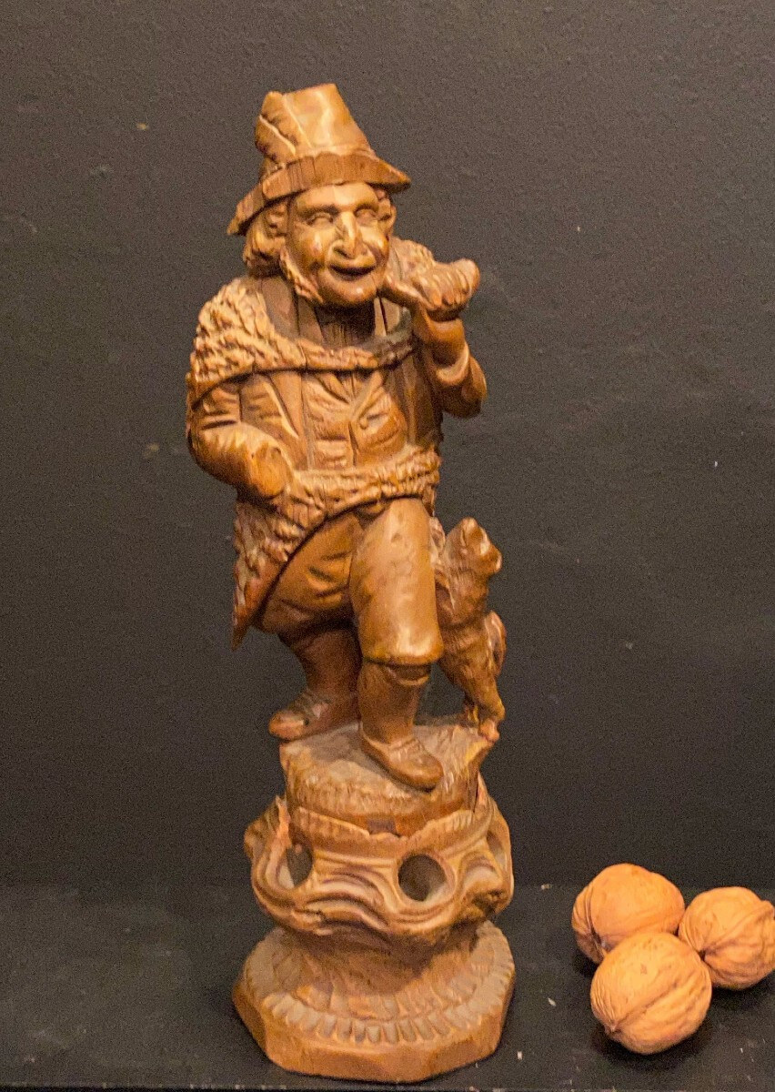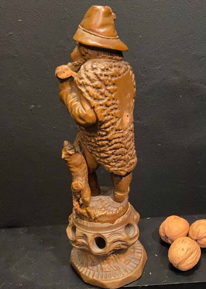 Statuette d'un homme avec une trompe, accompagné de son chien .Manque la hotte et une main.Diamètre : 5 cmHauteur : 24,5 cm