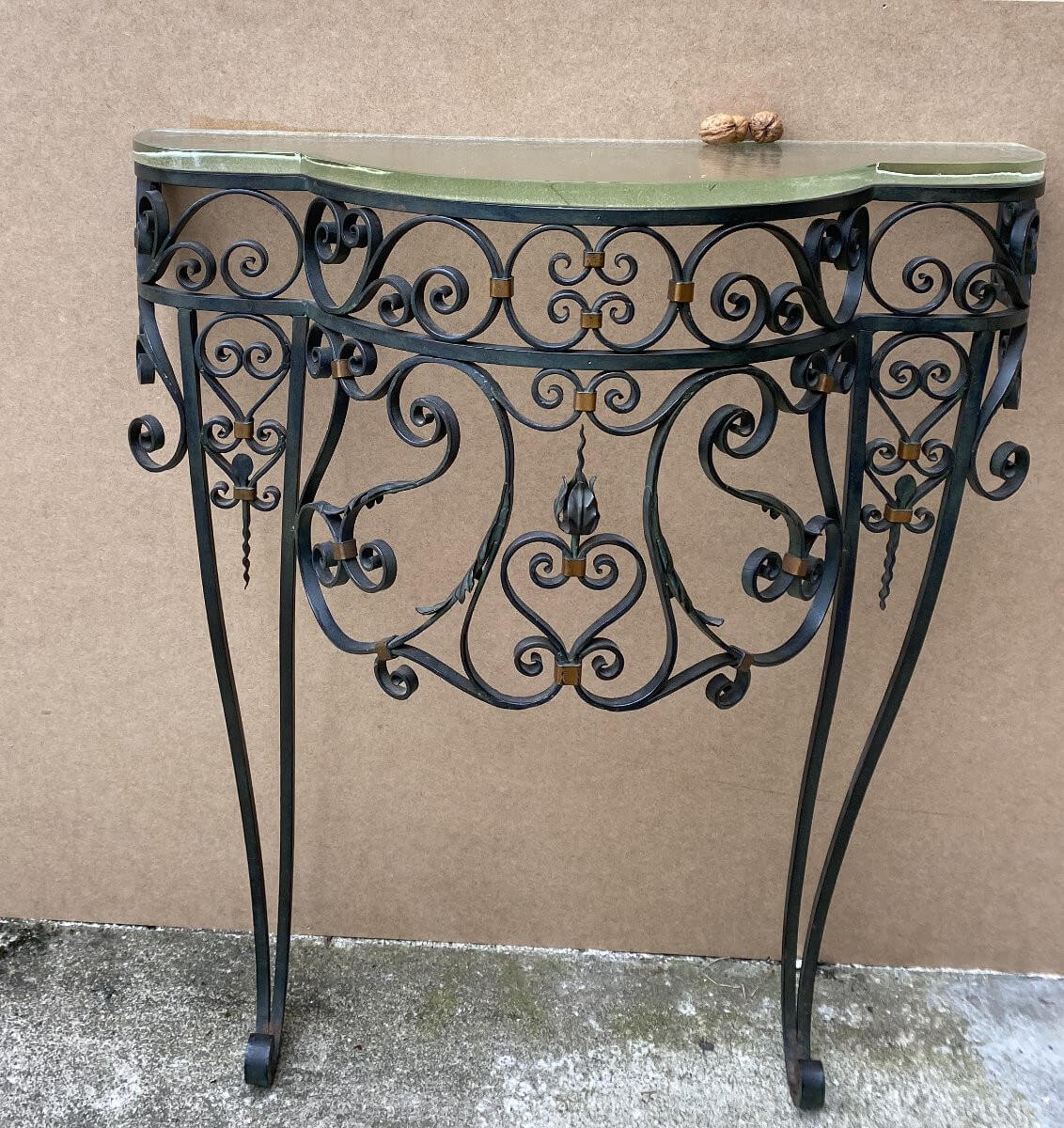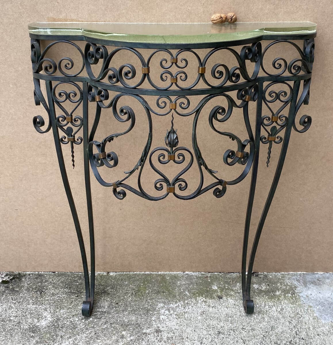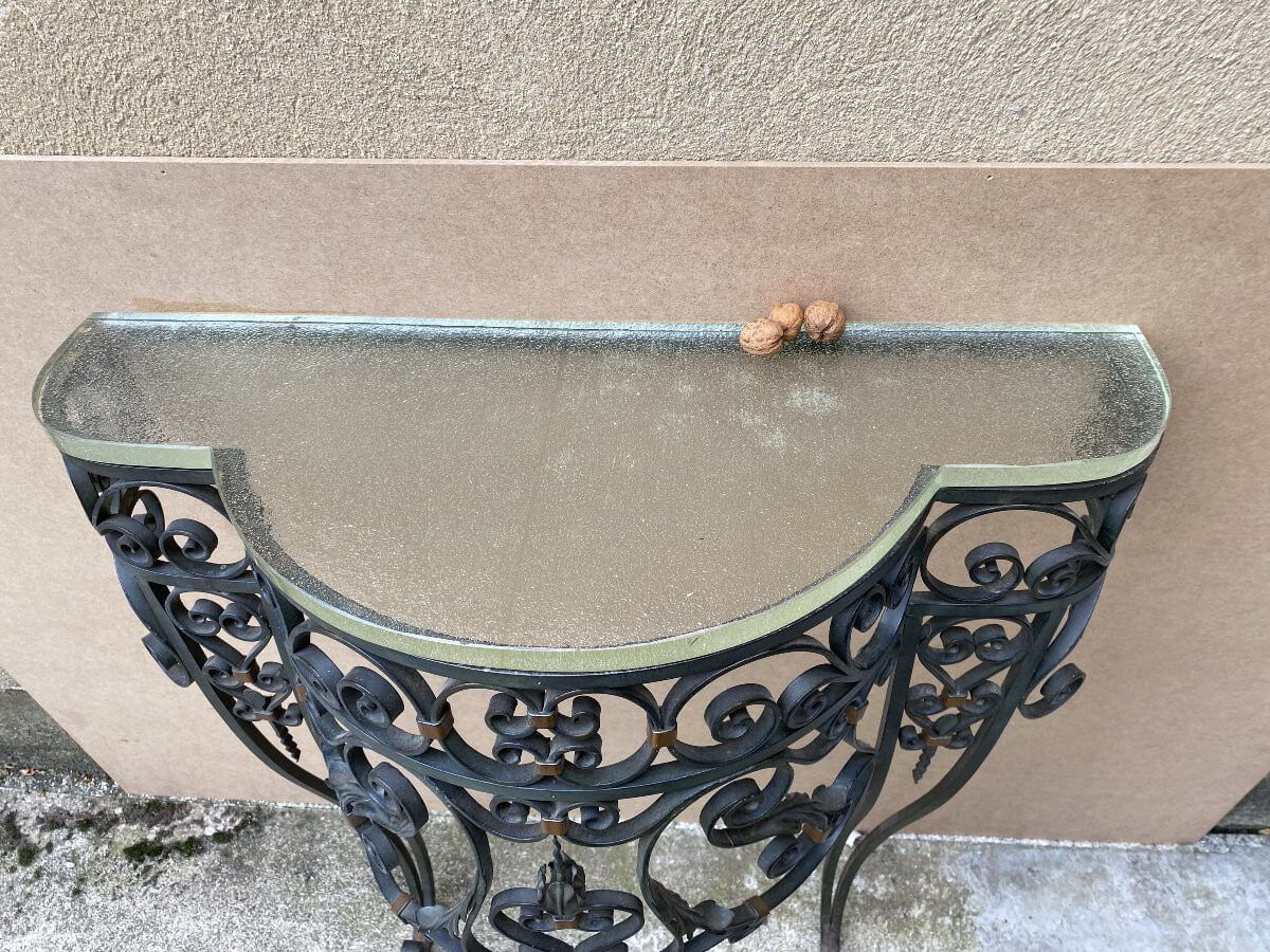 console en fer forgé à deux pieds, dessus de verre granité.Dimensions : 76 cm x 30 cm pour une hauteur de 93 cm