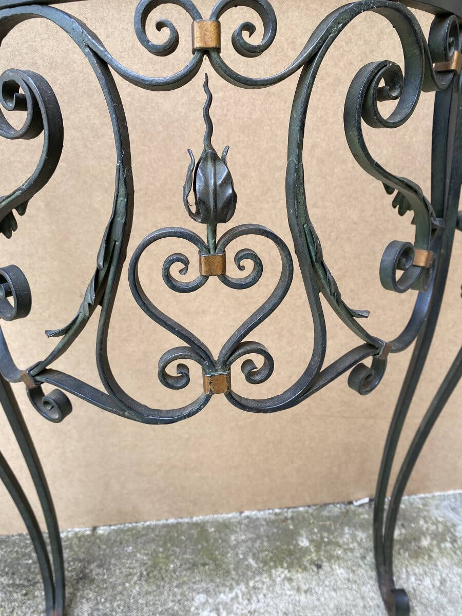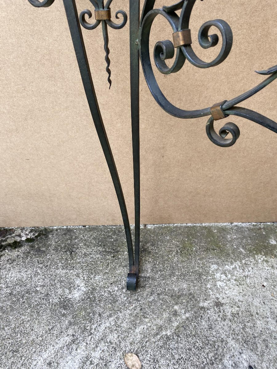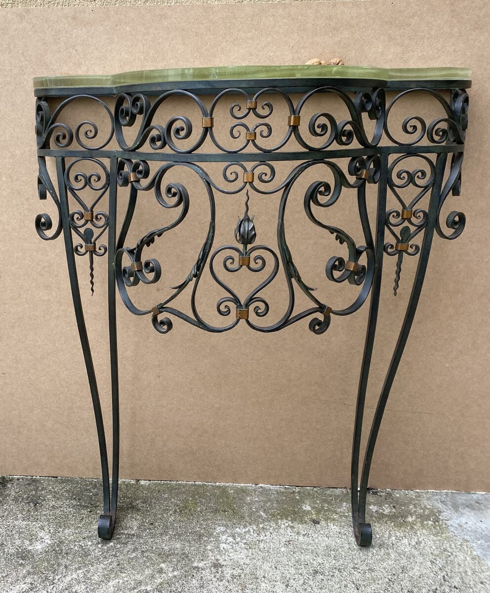 console en fer forgé à deux pieds, dessus de verre granité.Dimensions : 76 cm x 30 cm pour une hauteur de 93 cm