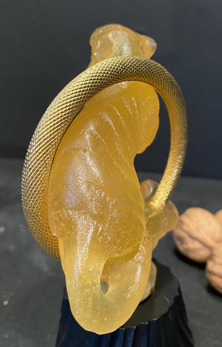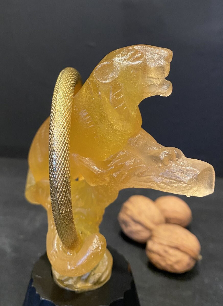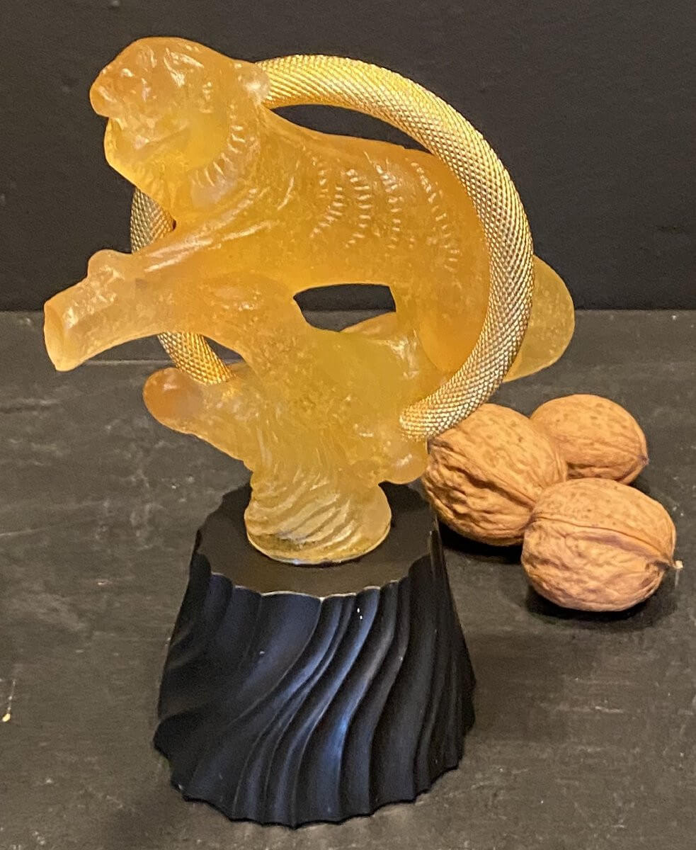 Bouchon ou presse papier représentant un tigre, socle en bois noir .réalisé par la maison Daum mais non signé .Dimensions : 12 cm de haut, 14 cm avec le socle.