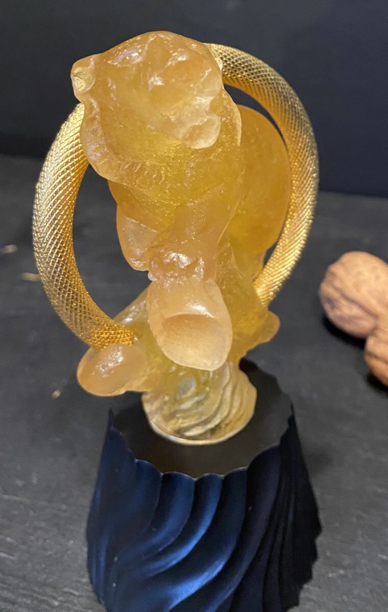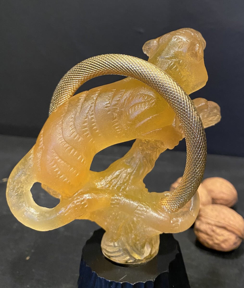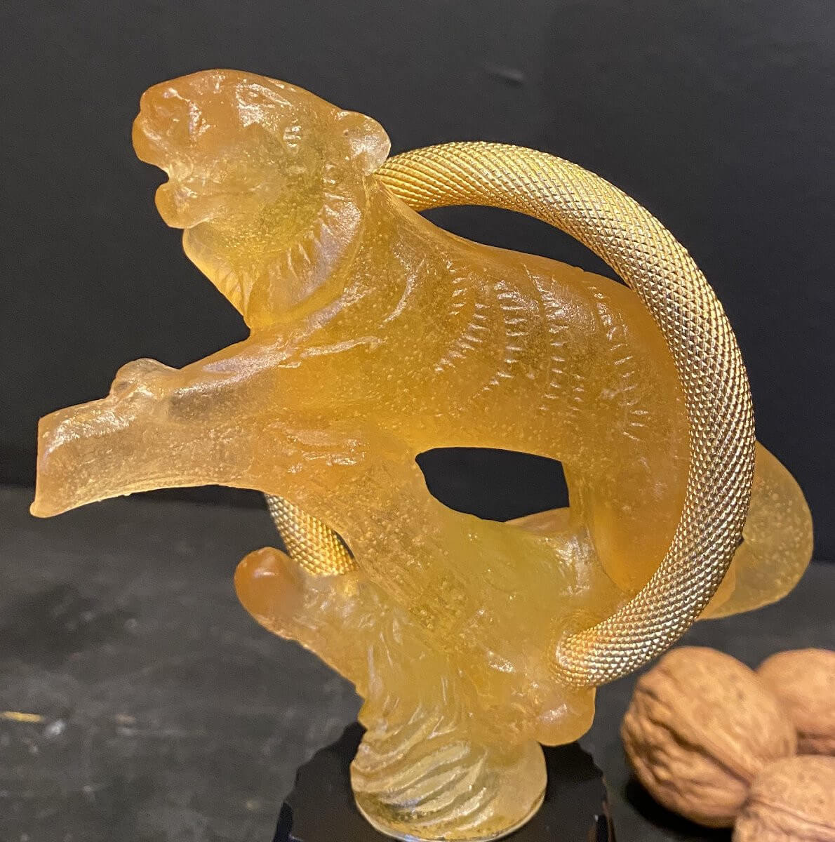 Bouchon ou presse papier représentant un tigre, socle en bois noir .réalisé par la maison Daum mais non signé .Dimensions : 12 cm de haut, 14 cm avec le socle.