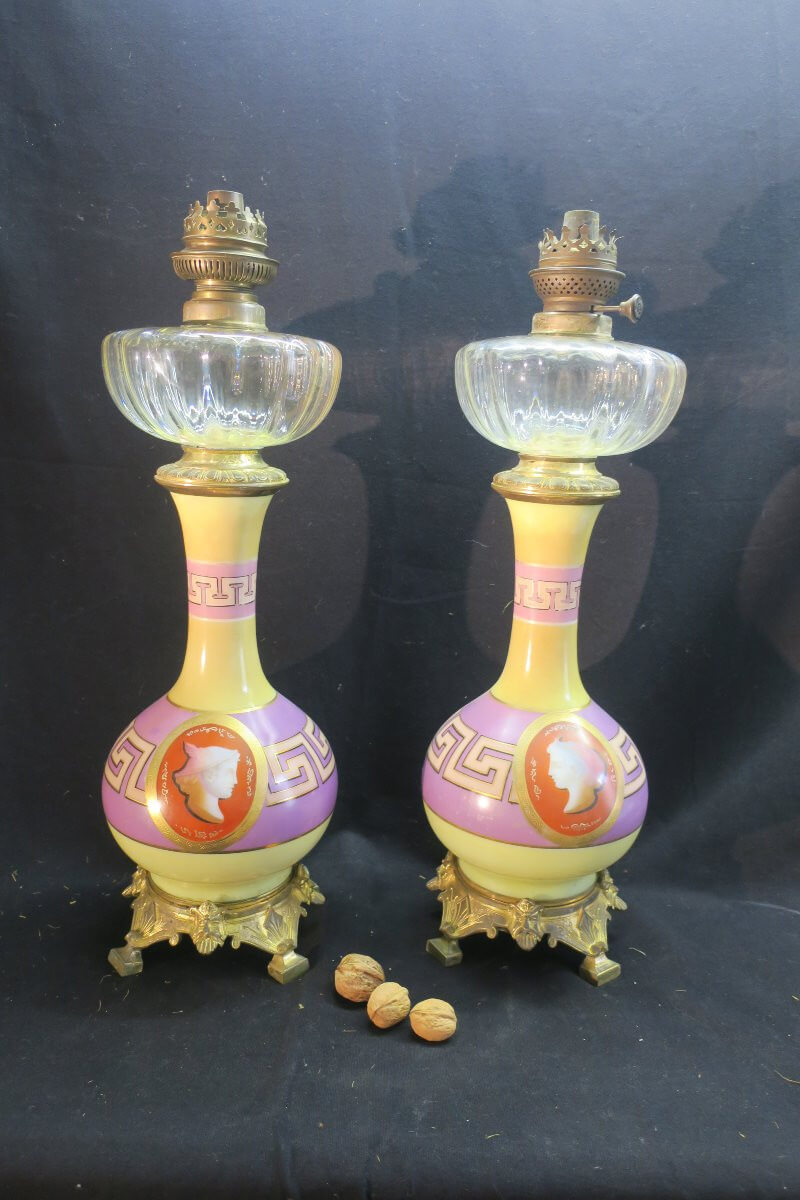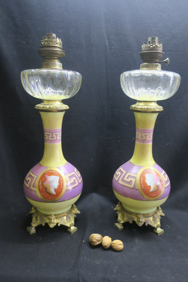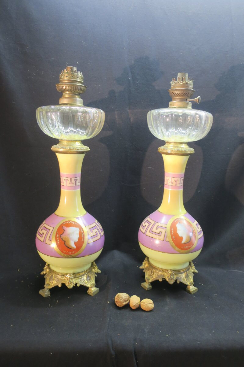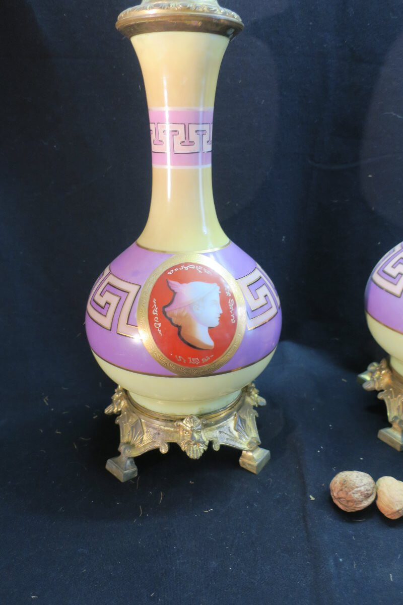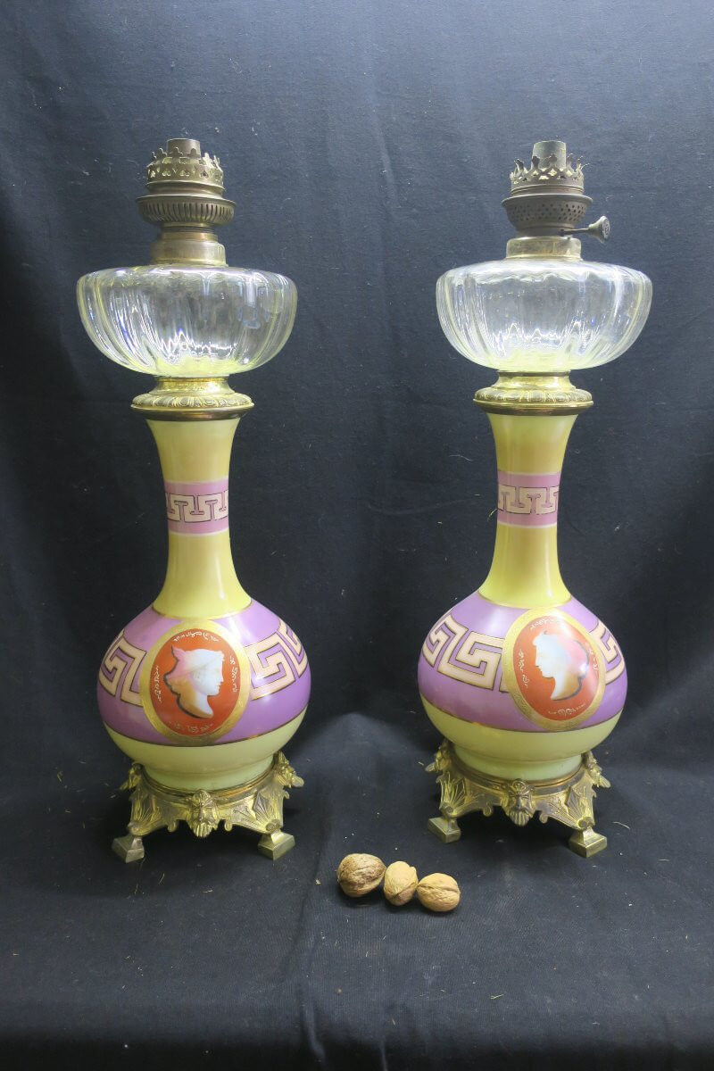 Grande paire de lampes à pétrole en opaline jaune et violette à décor à la grecque doré ornées de médaillons au profil de dieu et déesse grecques sur fond orange .Monture en bronze doré .56 cm de haut et19 cm de diamètre