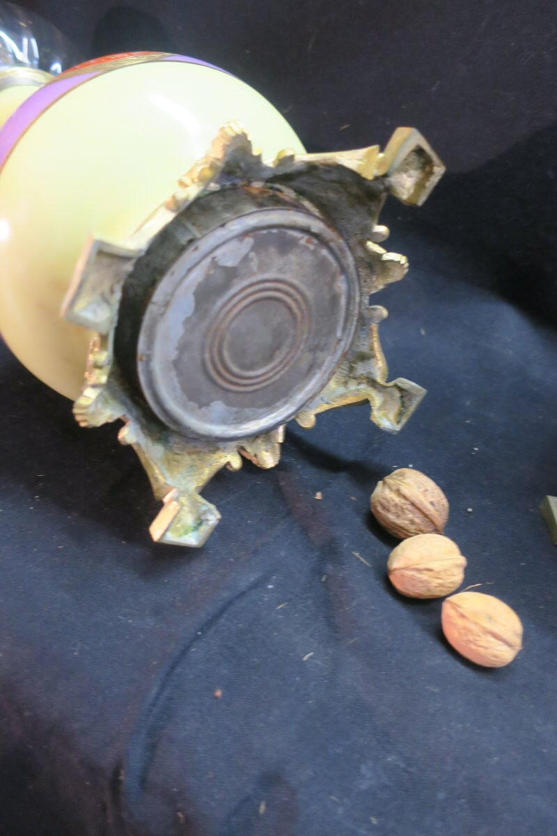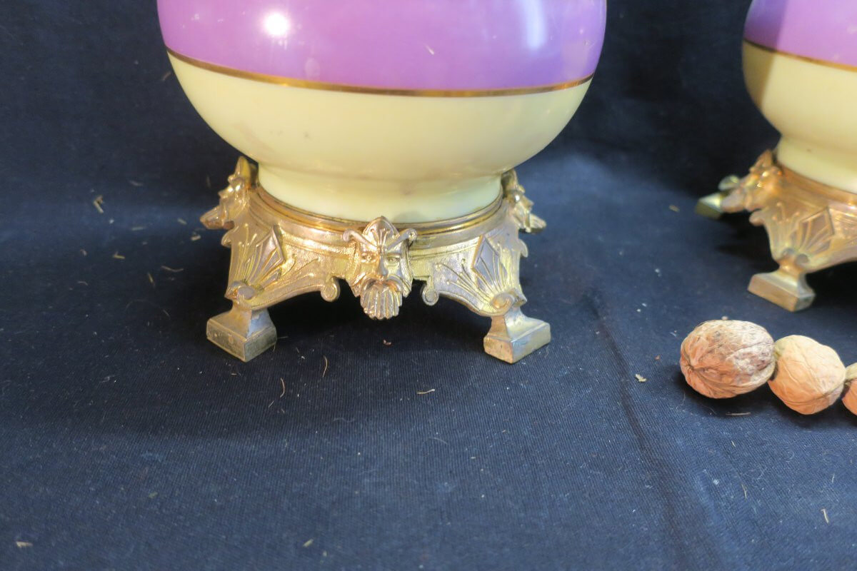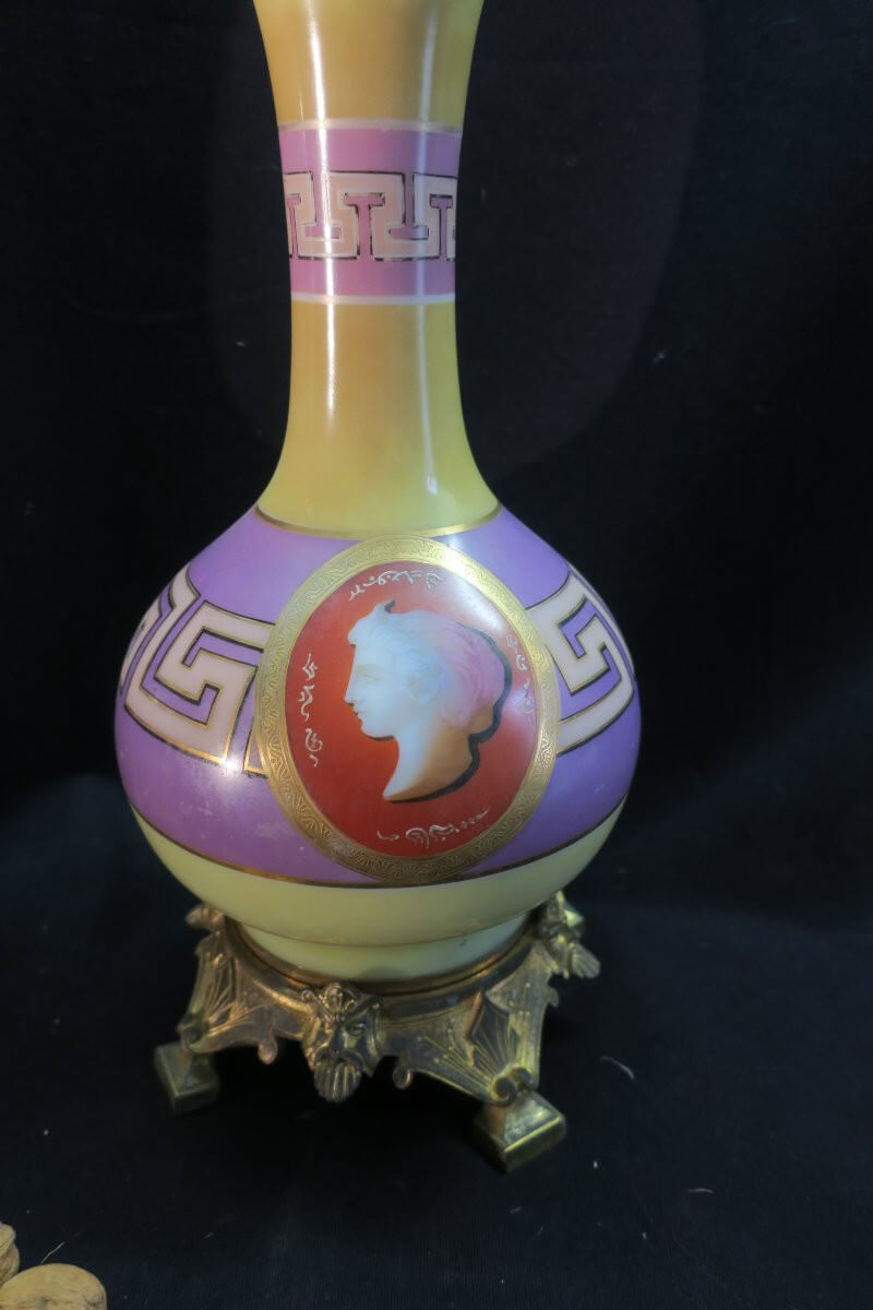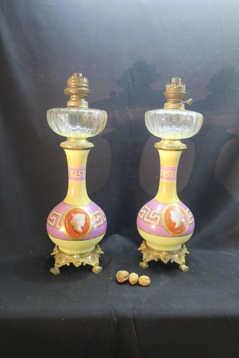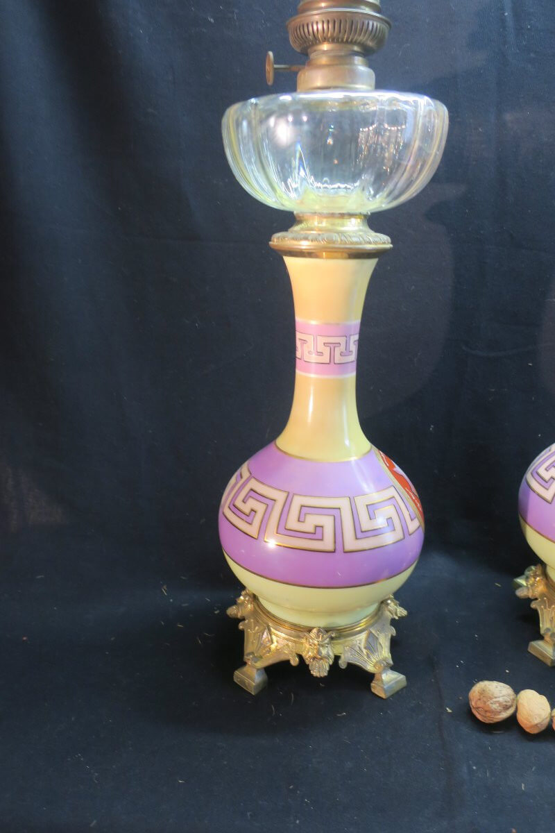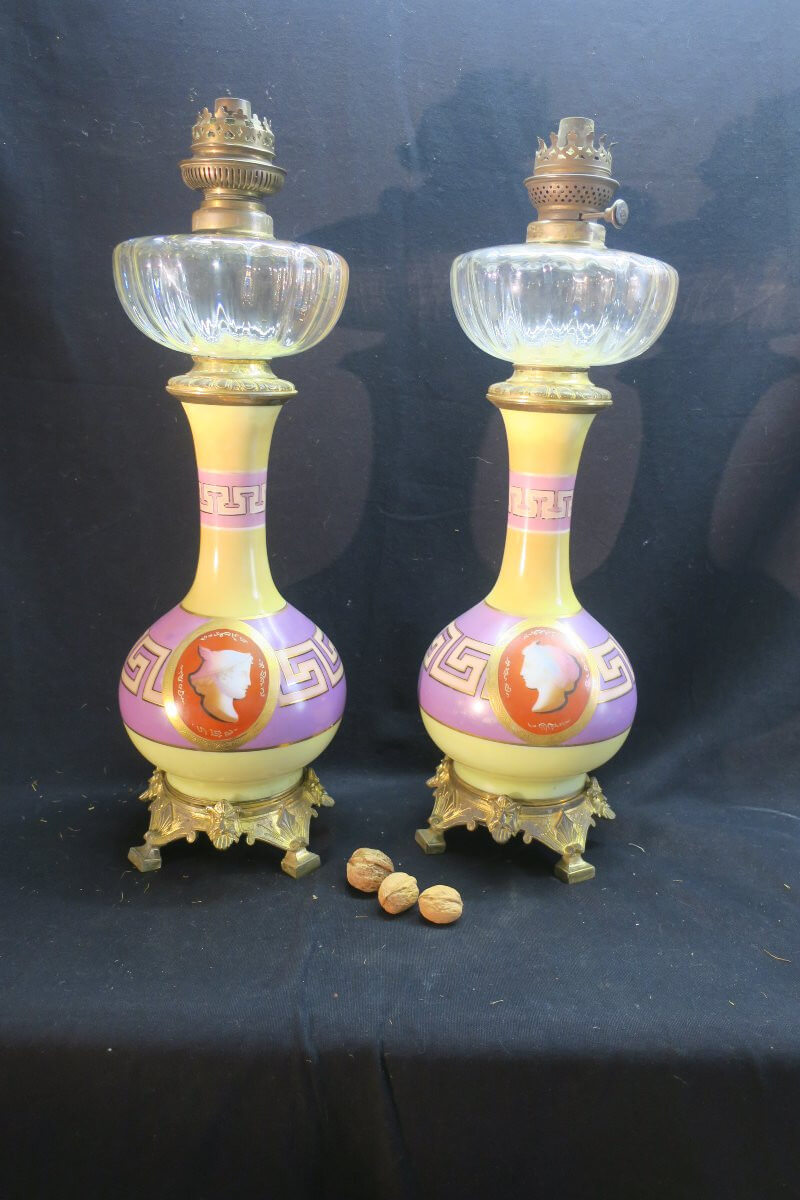 Grande paire de lampes à pétrole en opaline jaune et violette à décor à la grecque doré ornées de médaillons au profil de dieu et déesse grecques sur fond orange .Monture en bronze doré .56 cm de haut et19 cm de diamètre