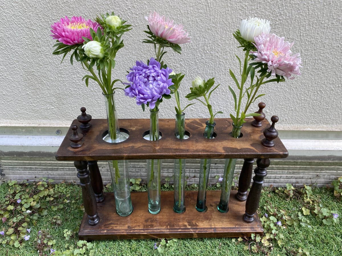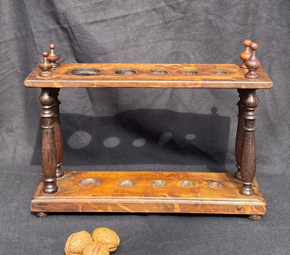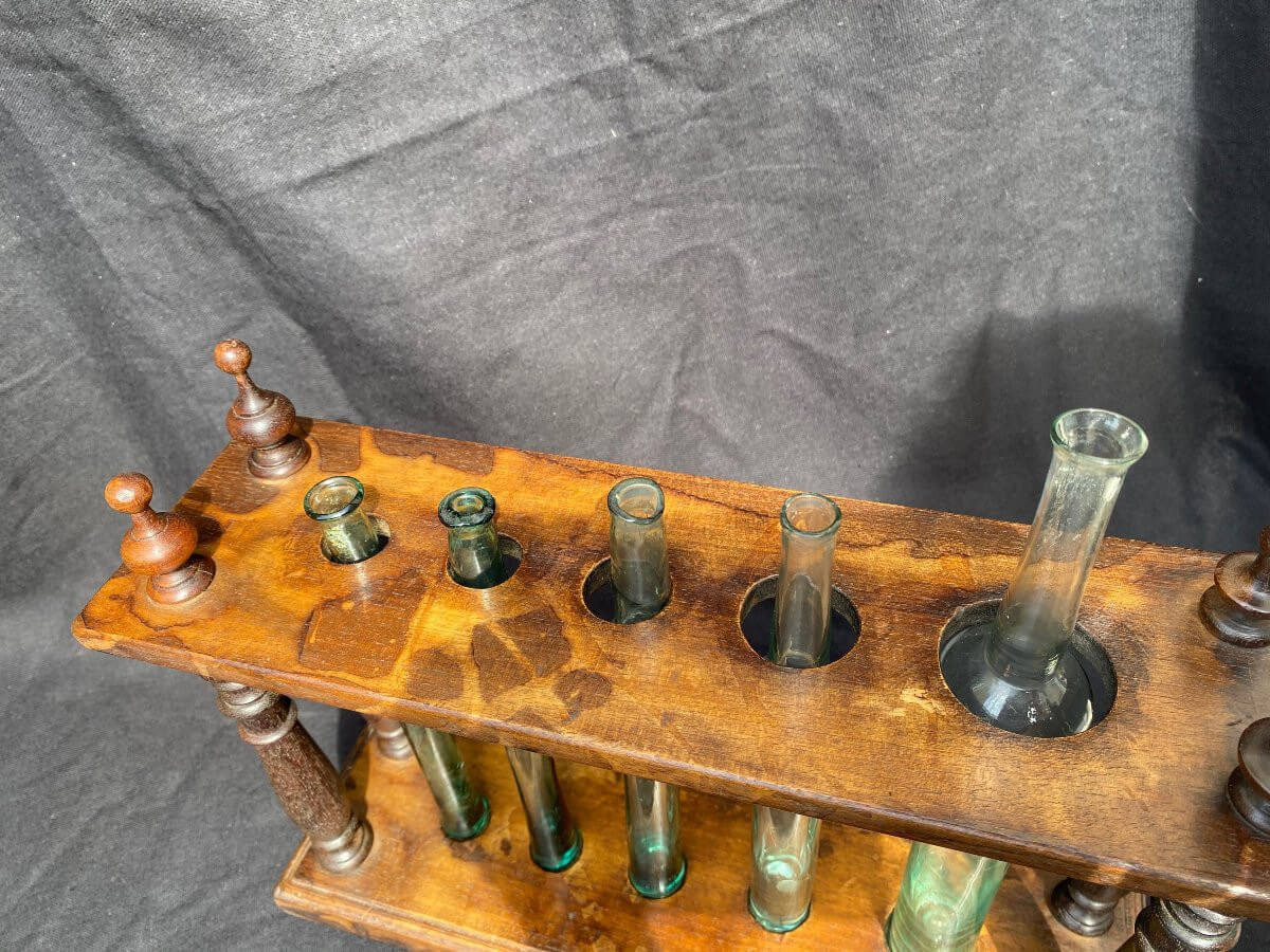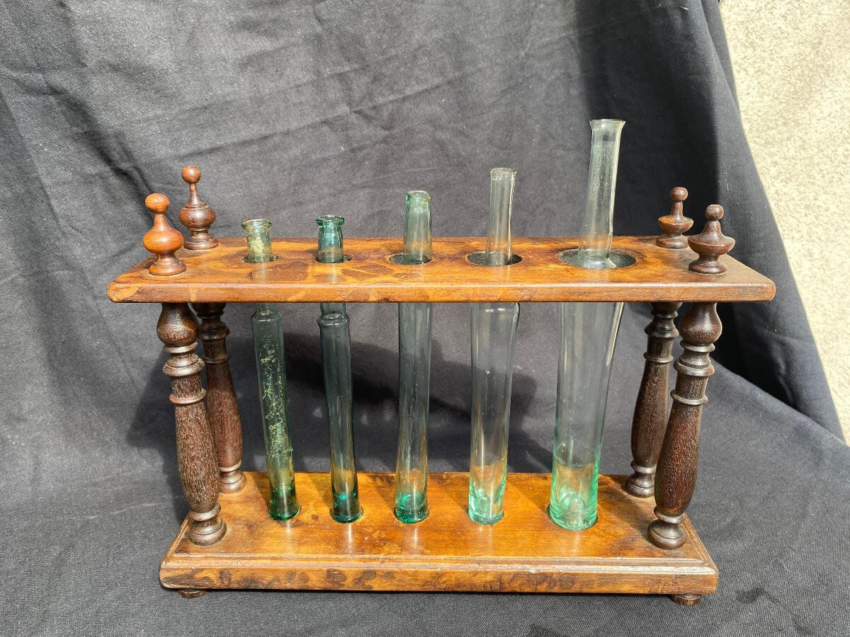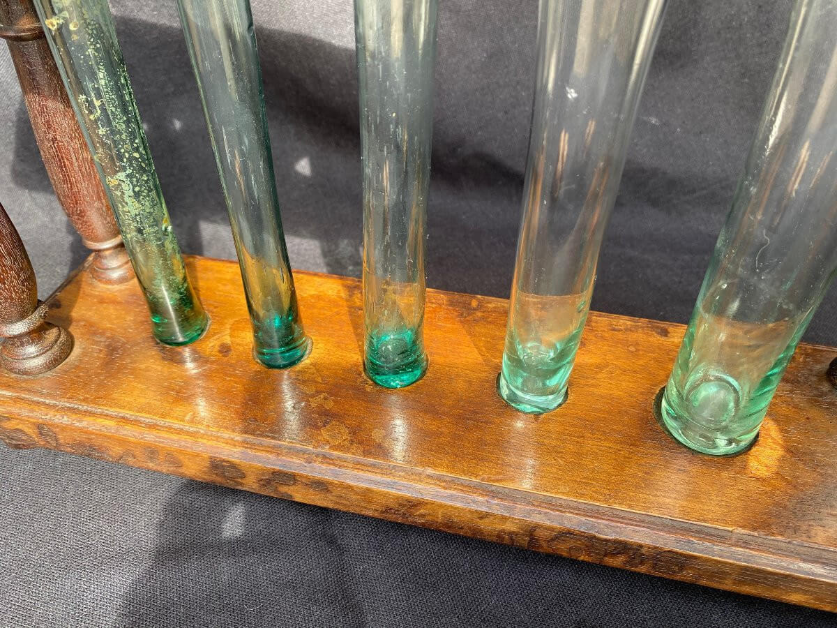 5 éprouvettes en verre soufflé et leur support en noyer datant du XVIII° siècle .Dimension du support : 33,3 cm x 10 cm pour une hauteur de 24,5 cmHauteur de la plus grande éprouvette : 25 cm
