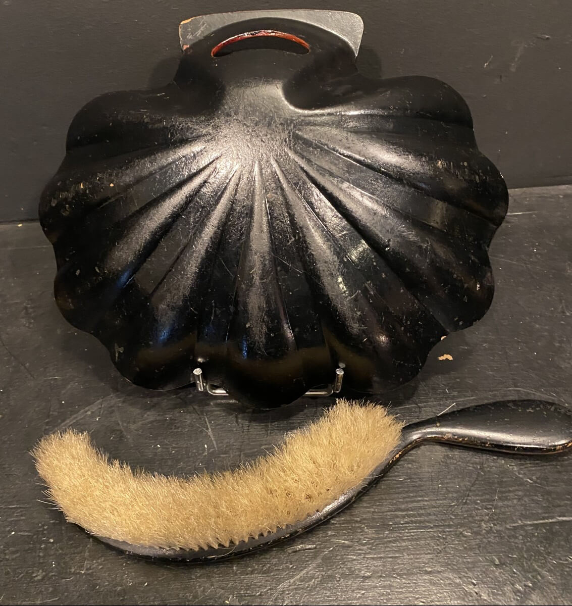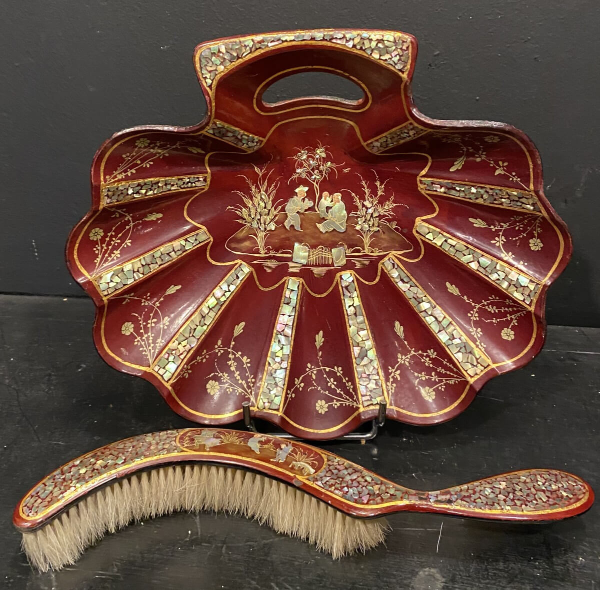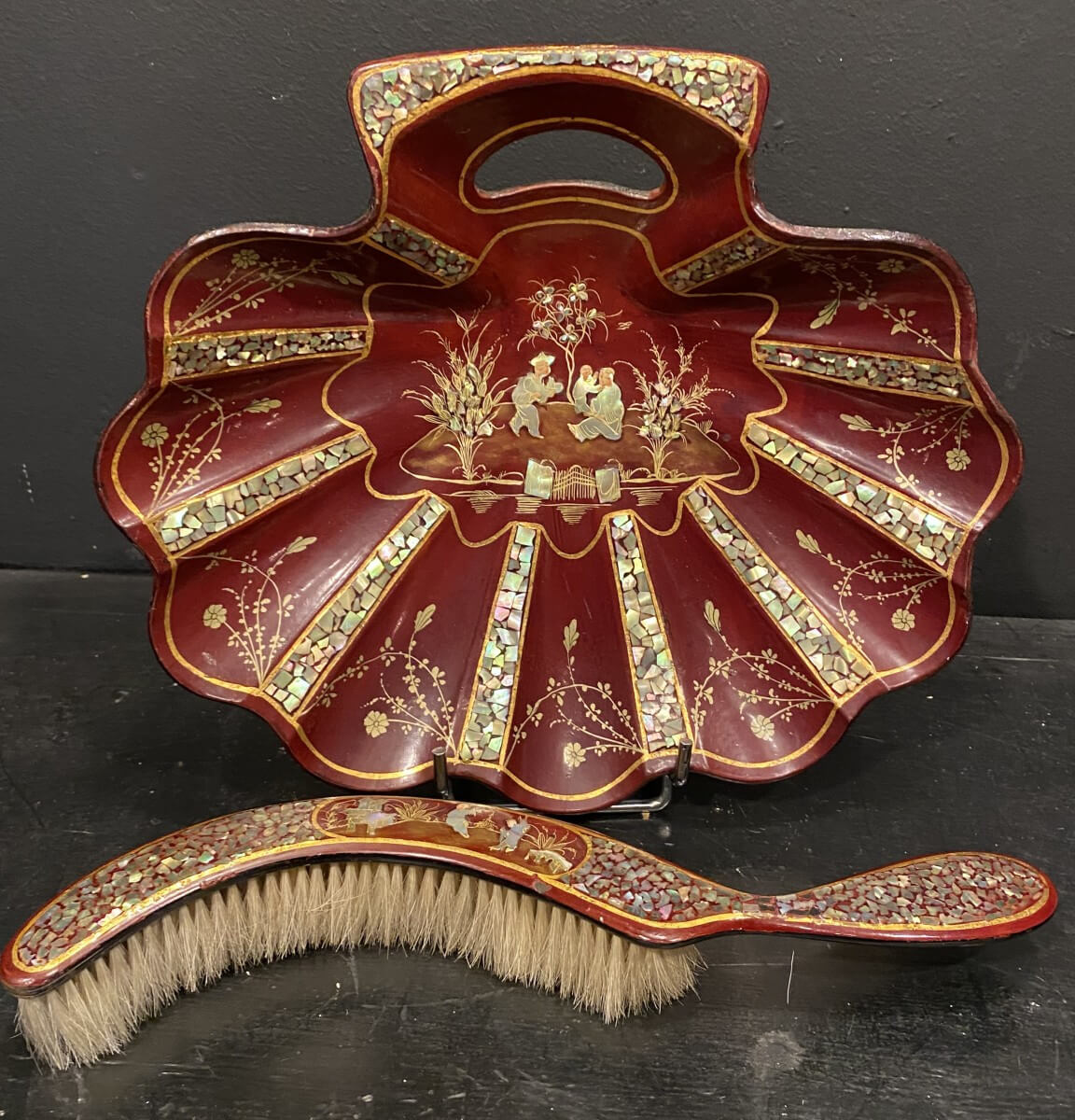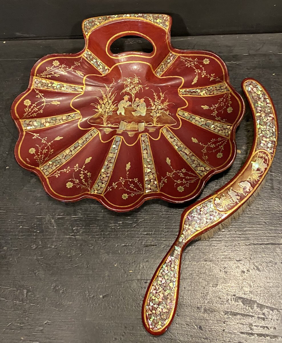 ramasse miettes et sa brosse en papier maché de Pont à mousson en laque rouge et incrustation de nacre