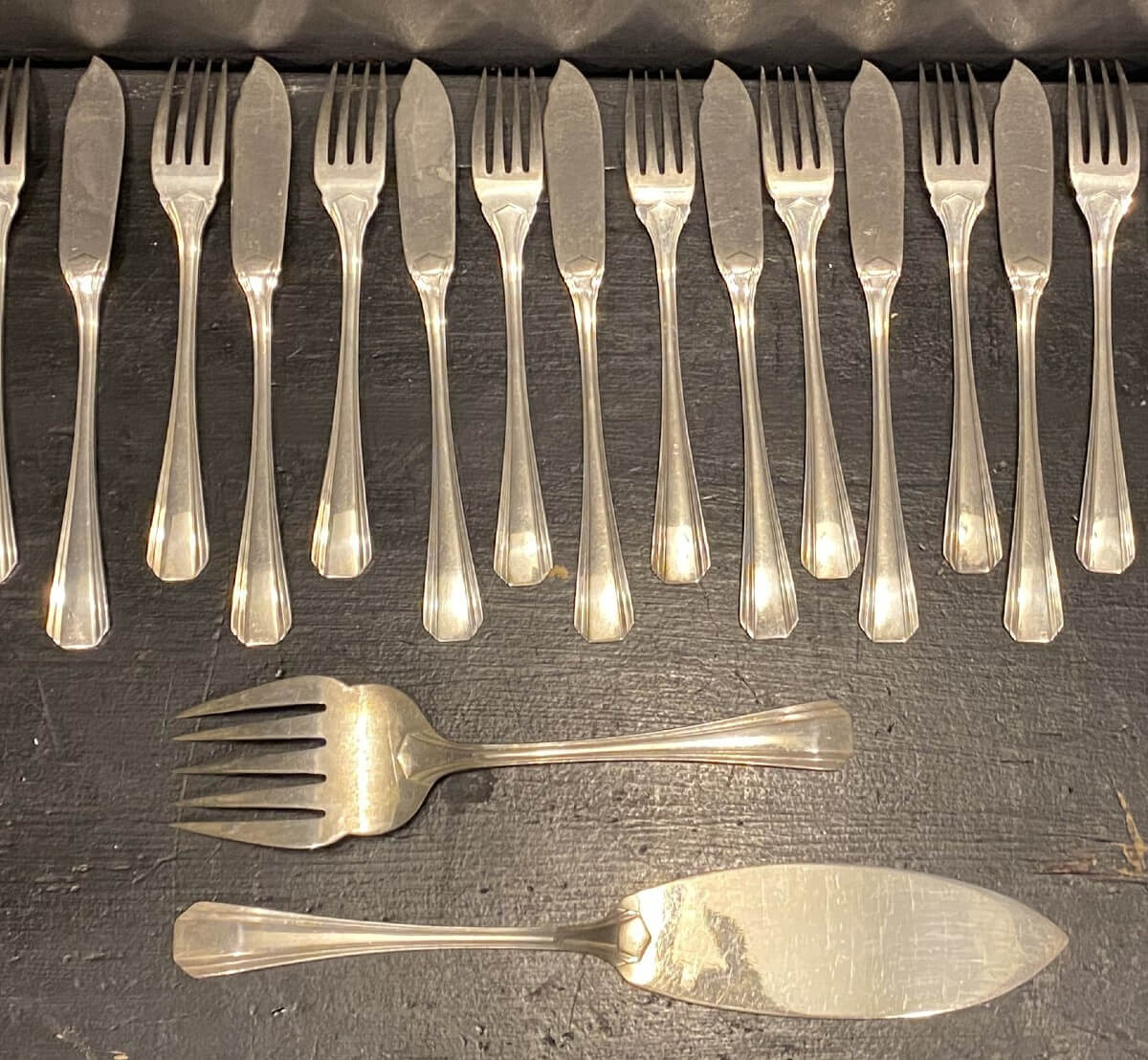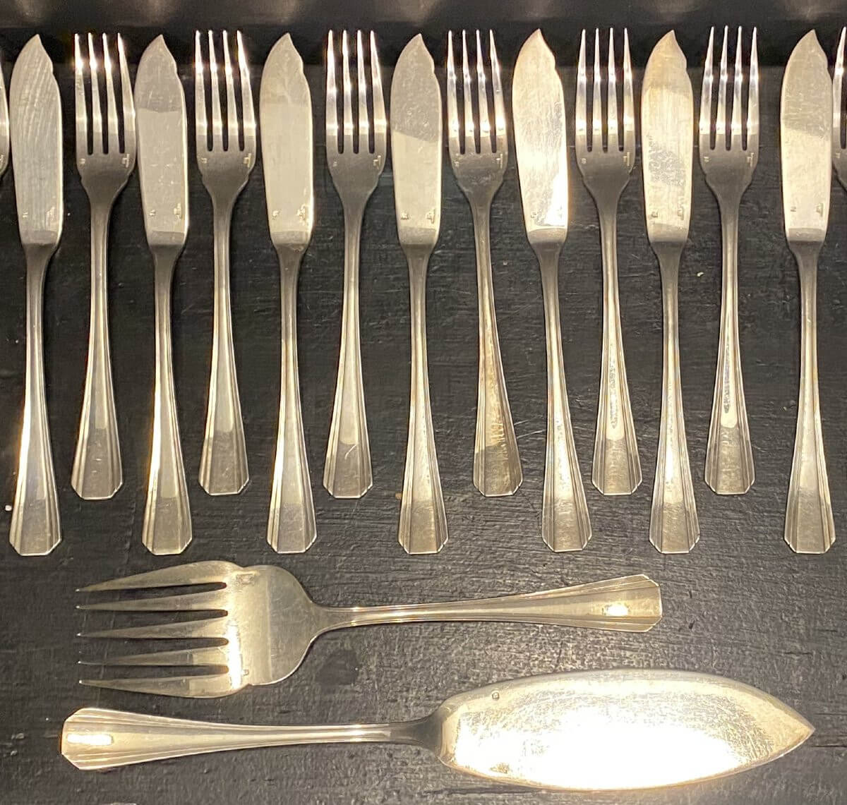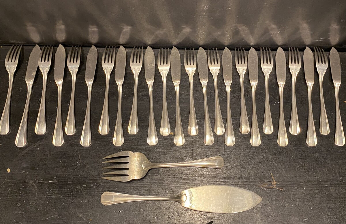 12 fourchettes et 12 couteaux à poisson avec les couverts de service de la maison Christofle.
