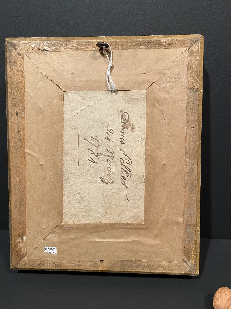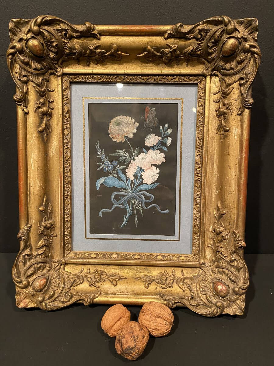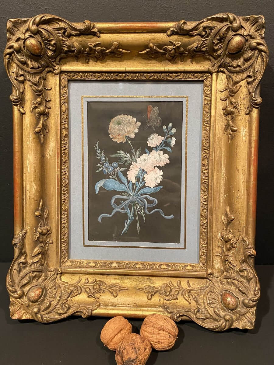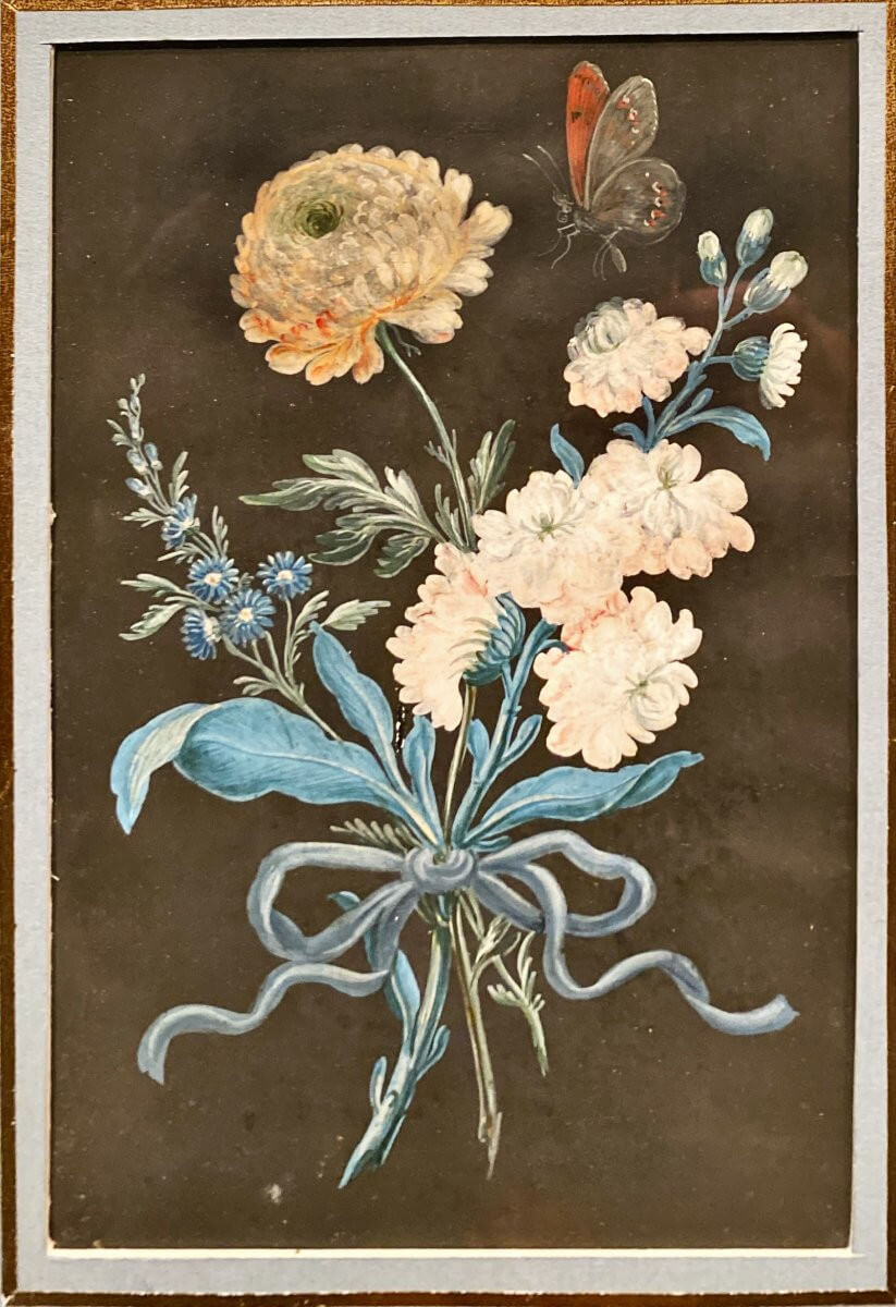 Petit tableau, gouache sur papier, représentant un bouquet de fleurs nouées avac un papillon à l'approche .Porte une inscription au dos : Denis Sellier 24 mars 1784 .Encadrement en bois mouluré et doré d'époque XIX°