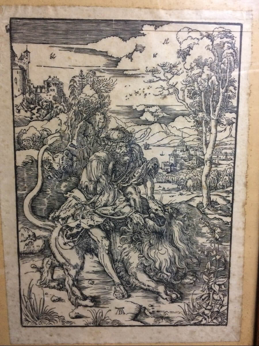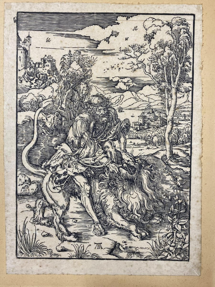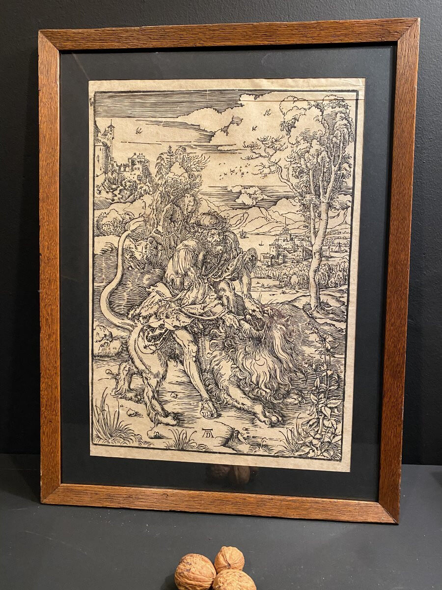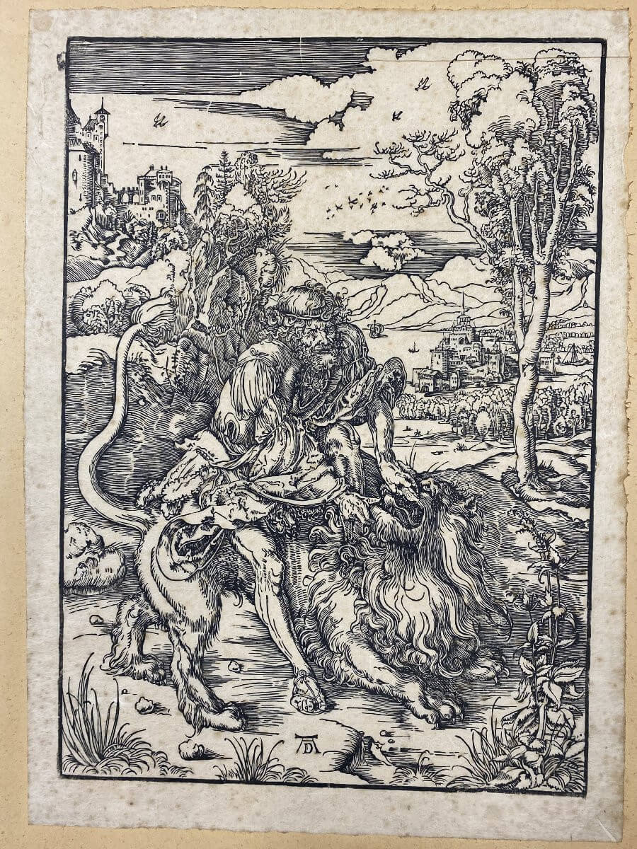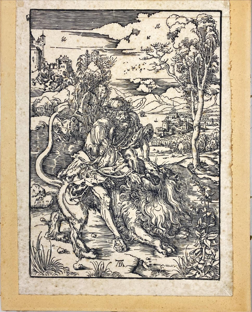 Gravure de très belle facture, tirage XIX° sur un beau papier japonais, représentant Samson terrassant le lion de Albrecht Dürer (1471-1528 )Dimension du cadre : 38,3 cm x 50,3 cmDimension du papier : 30,5 cm x 40,5 cm