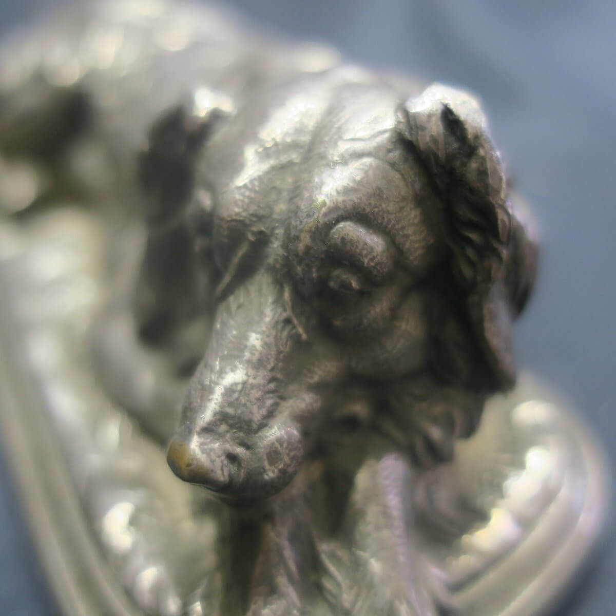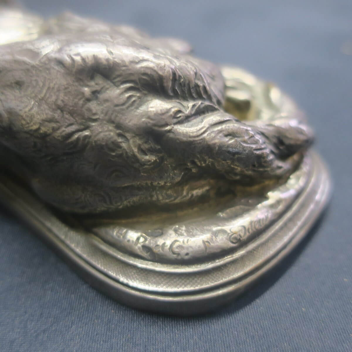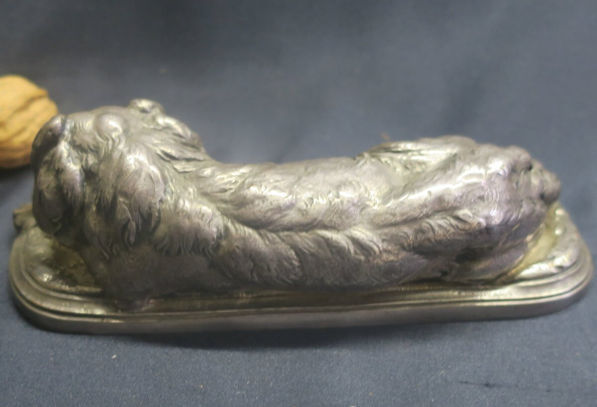 Bronze argenté représentant un chien couché .Signé HingreH P et Cie éditeur.18,5 cm x 7 cm pour une hauteur de 5 cm