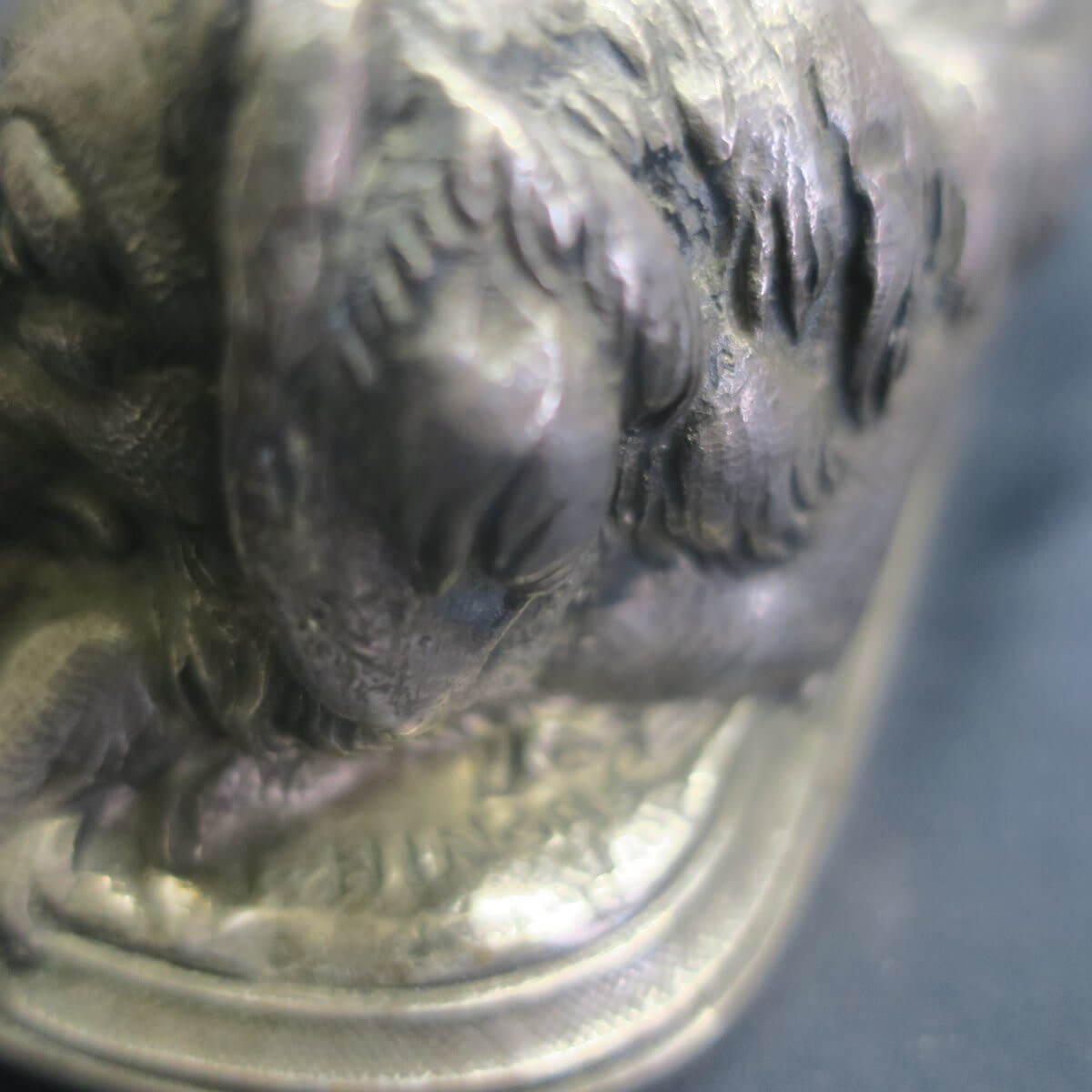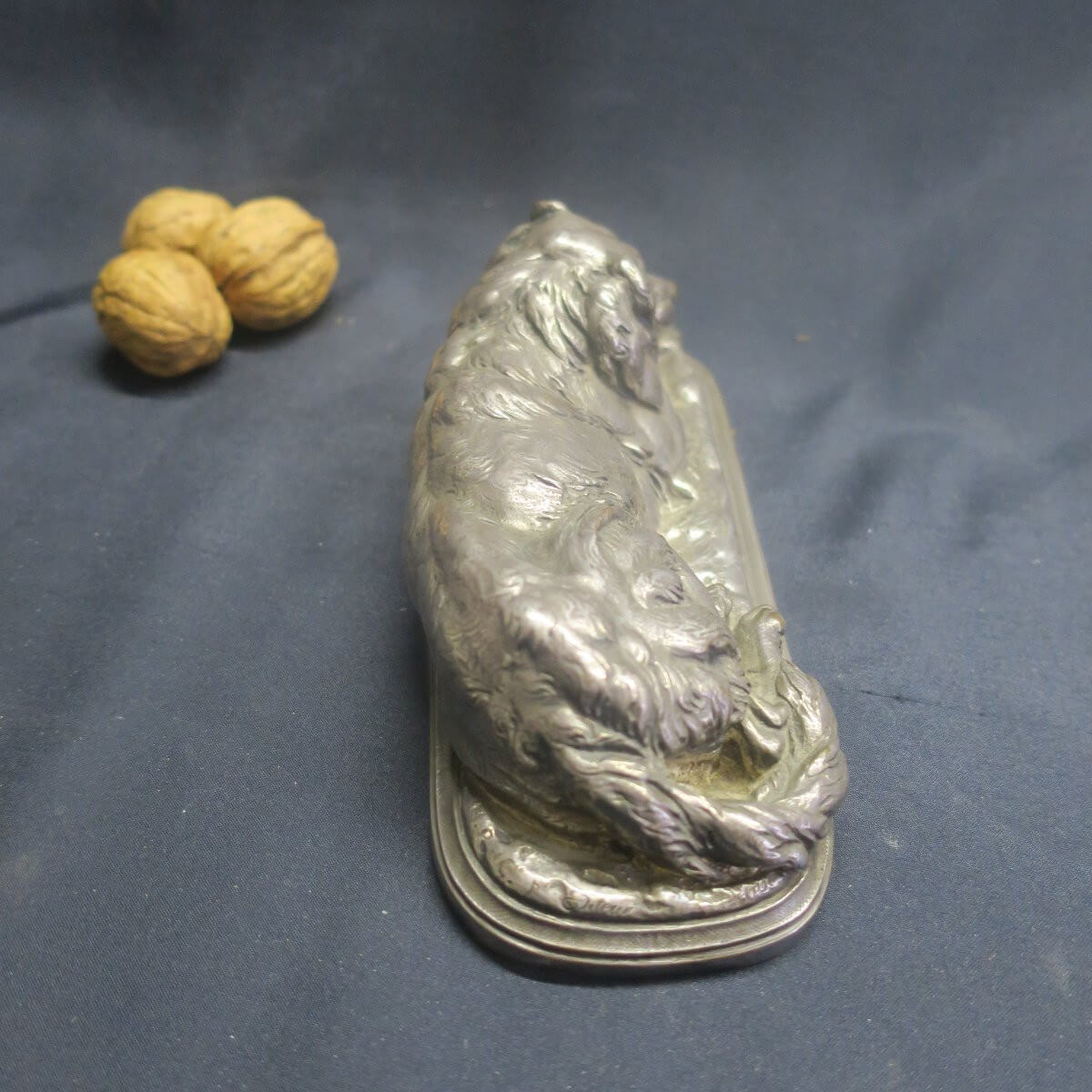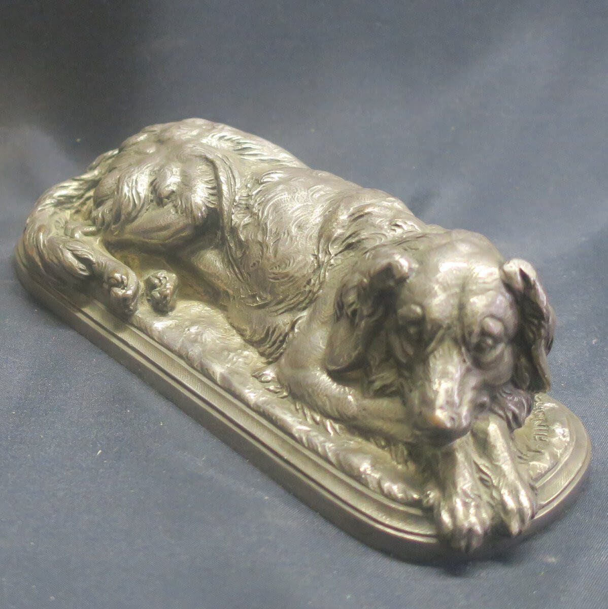 Bronze argenté représentant un chien couché .Signé HingreH P et Cie éditeur.18,5 cm x 7 cm pour une hauteur de 5 cm