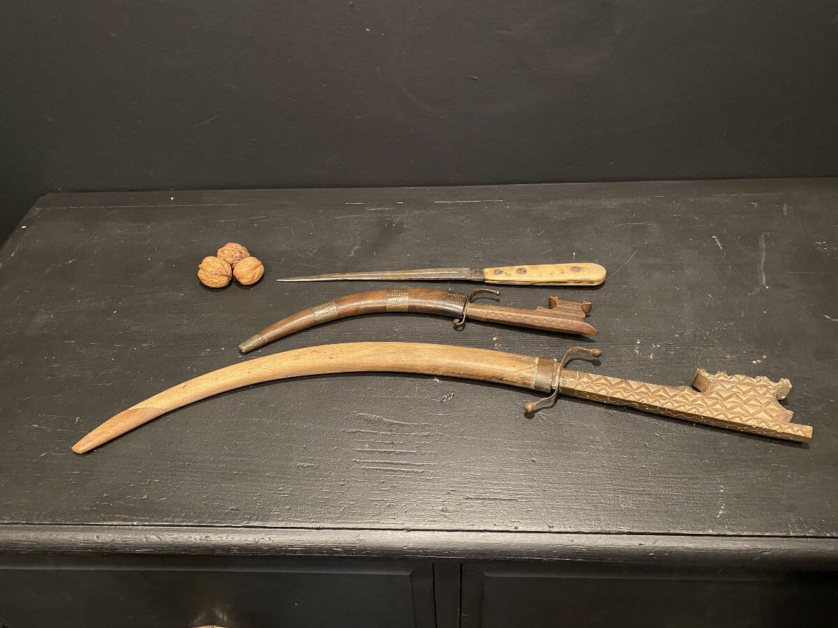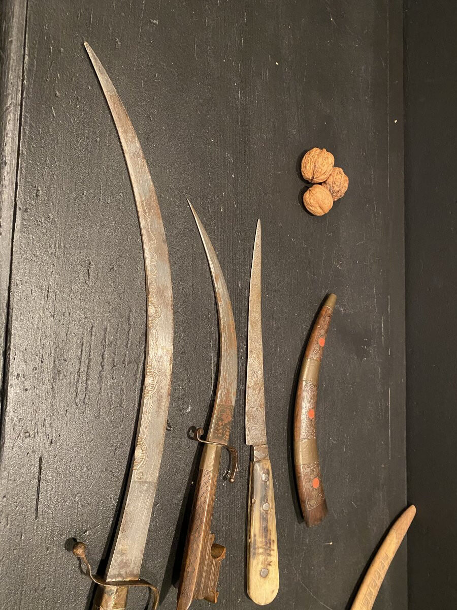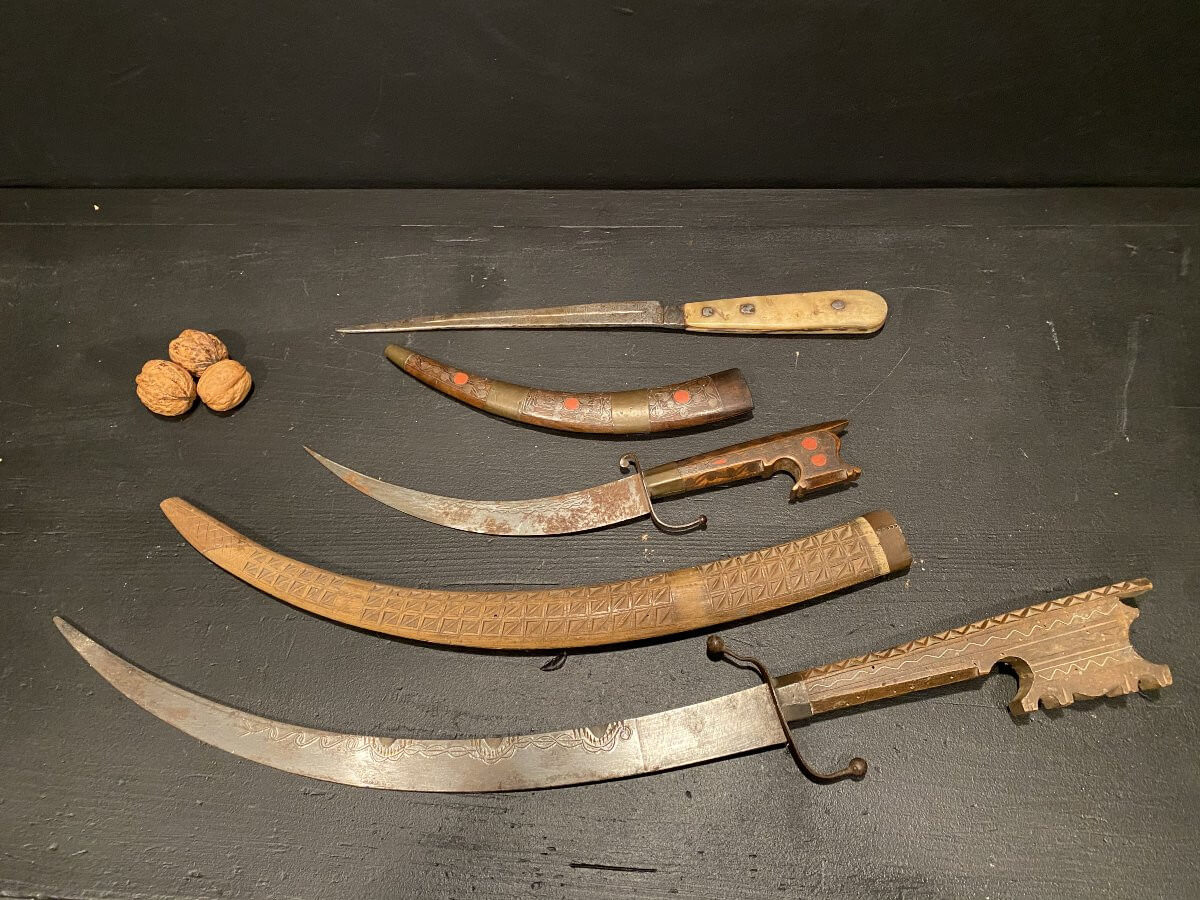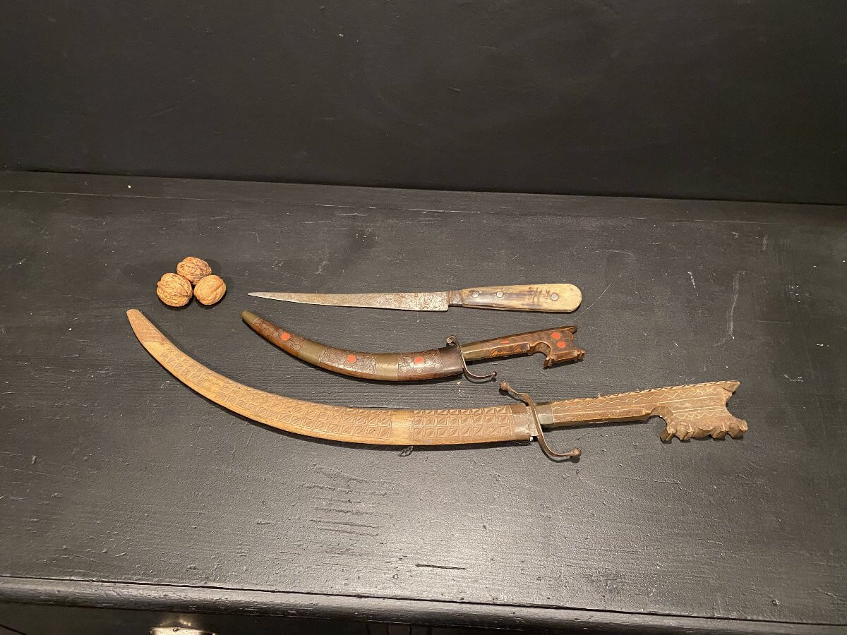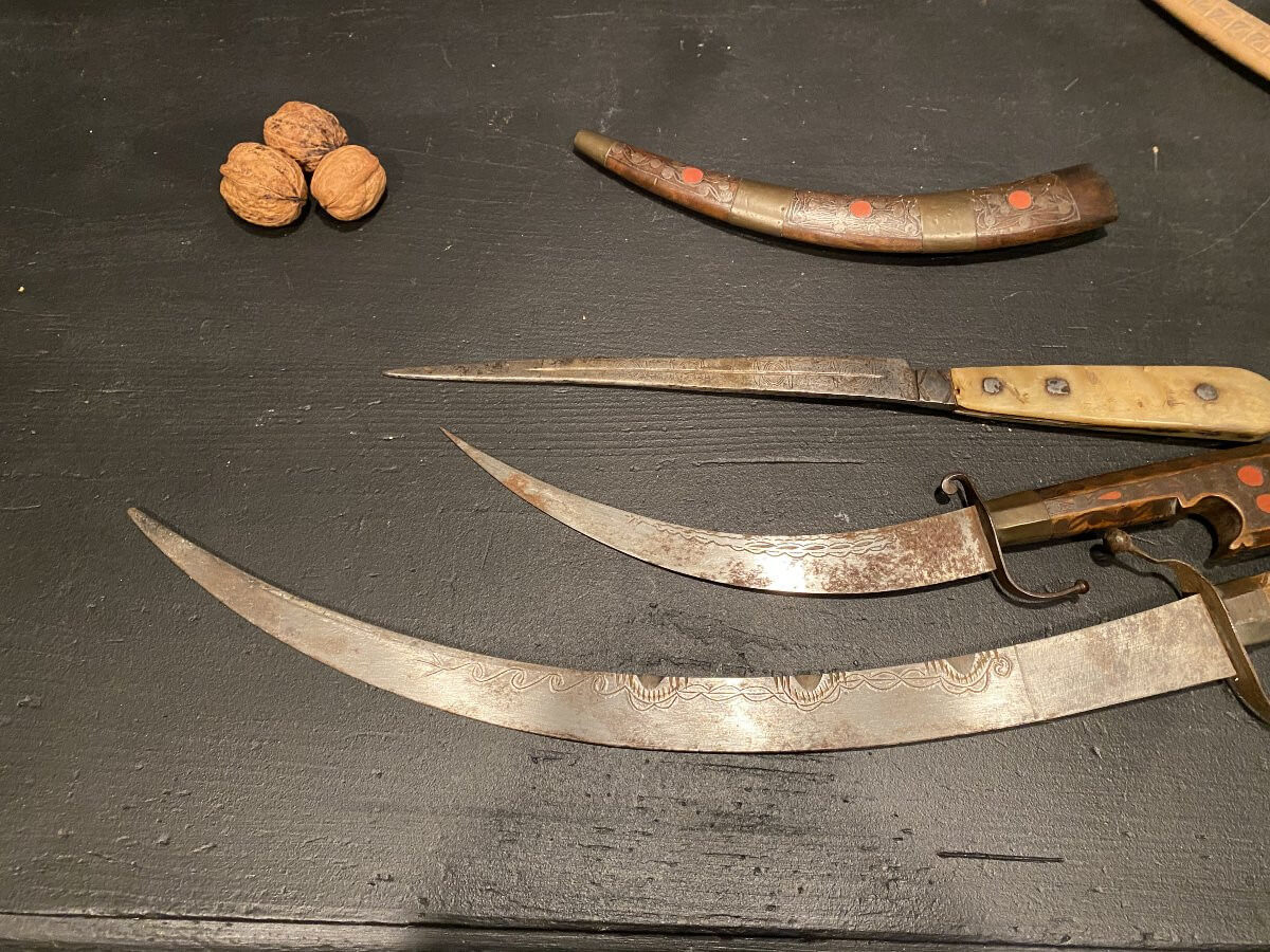 trois poignards datant du XIX° siecle et provenant du maghreb .Longueurs : 61 cm,35 cm et 34 cm