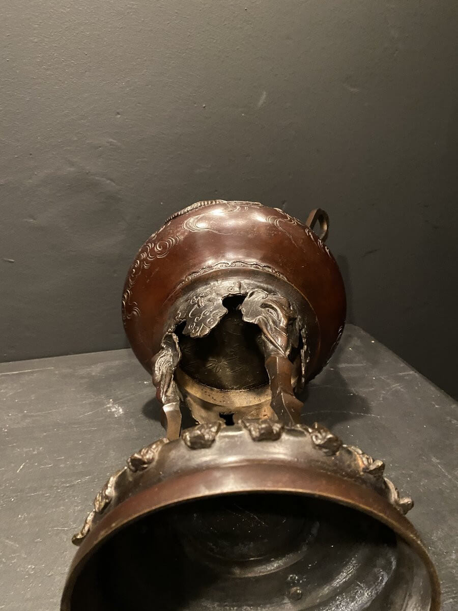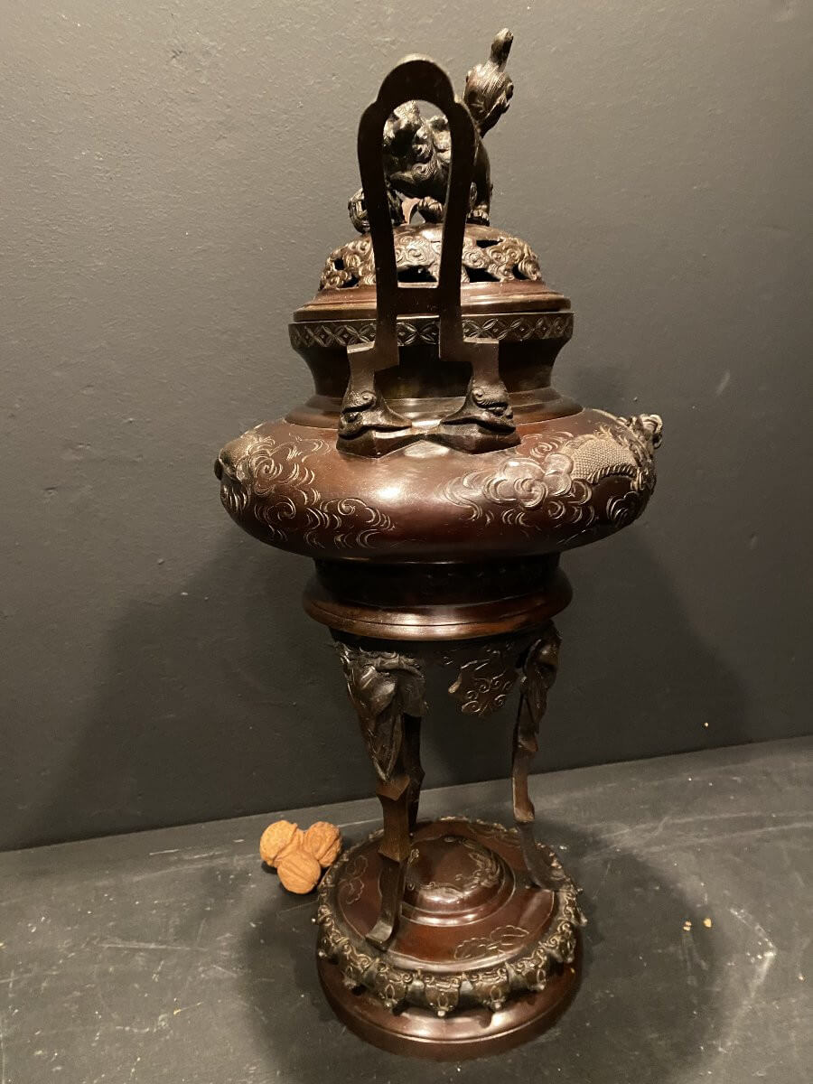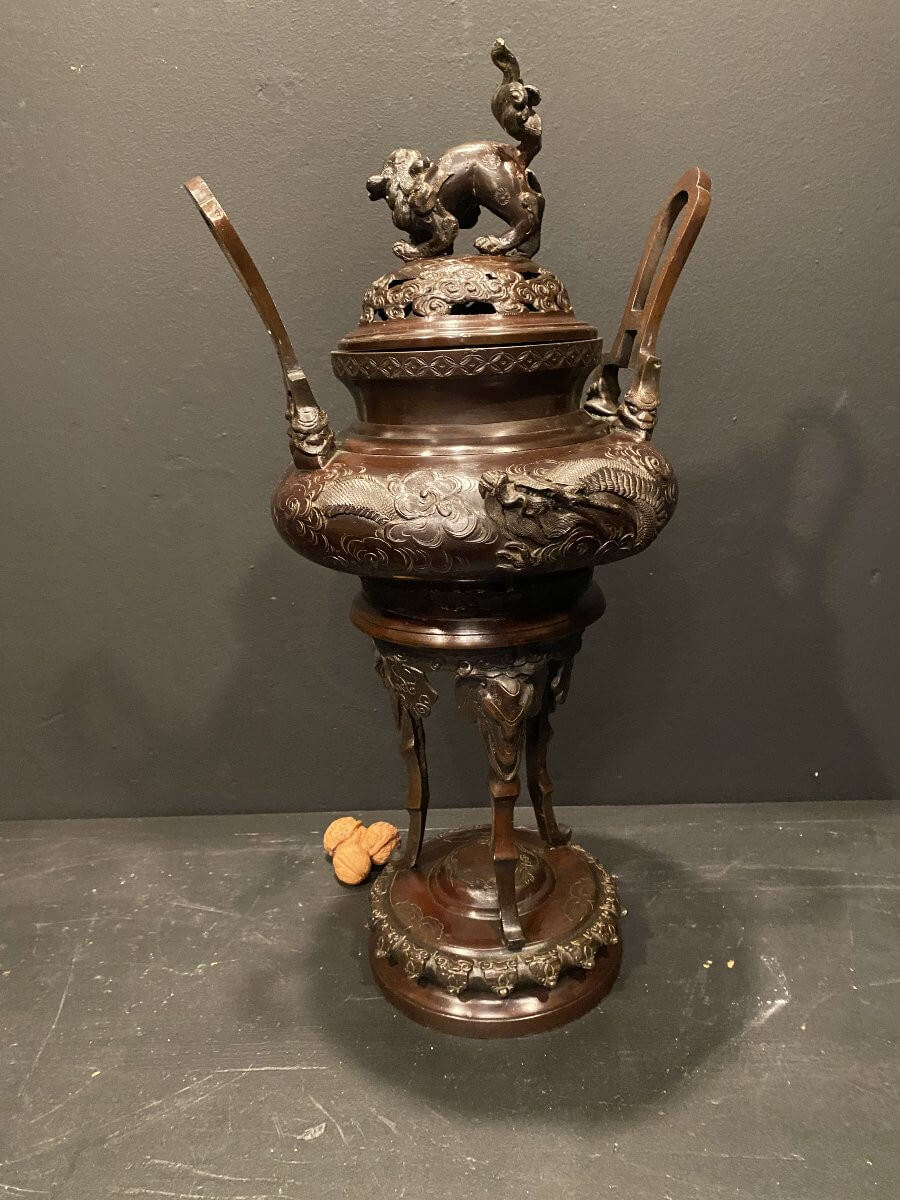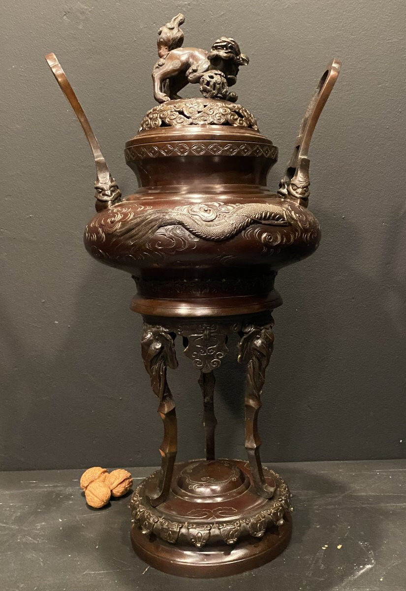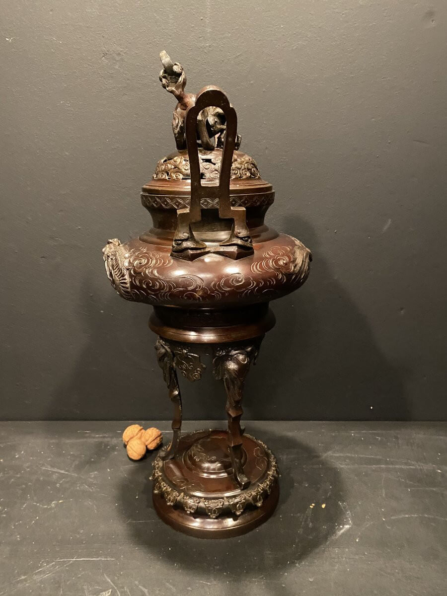 Brule parfum en bronze à patine brune-rouge, à décor de tête d'éléphant .Couvercle ajouré surmonté d'un chien de fô .A noter : une soudure à la queue .Largeur : 27 cmProfondeur : 23 cmHauteur : 52 cm