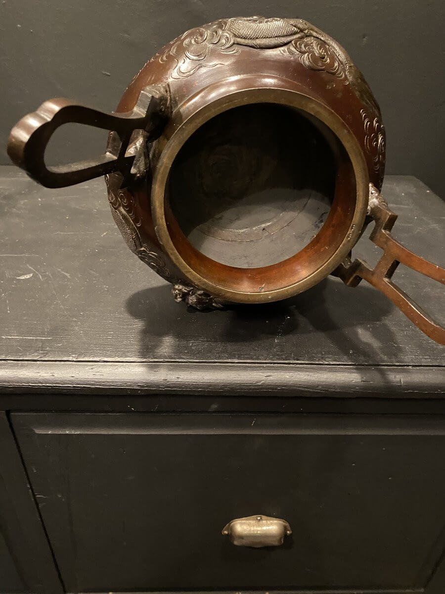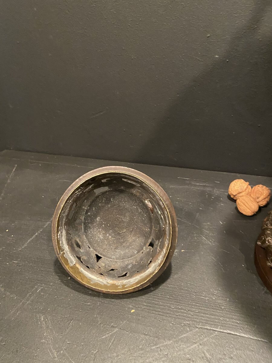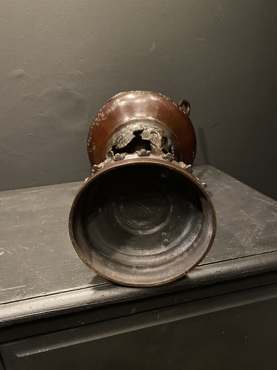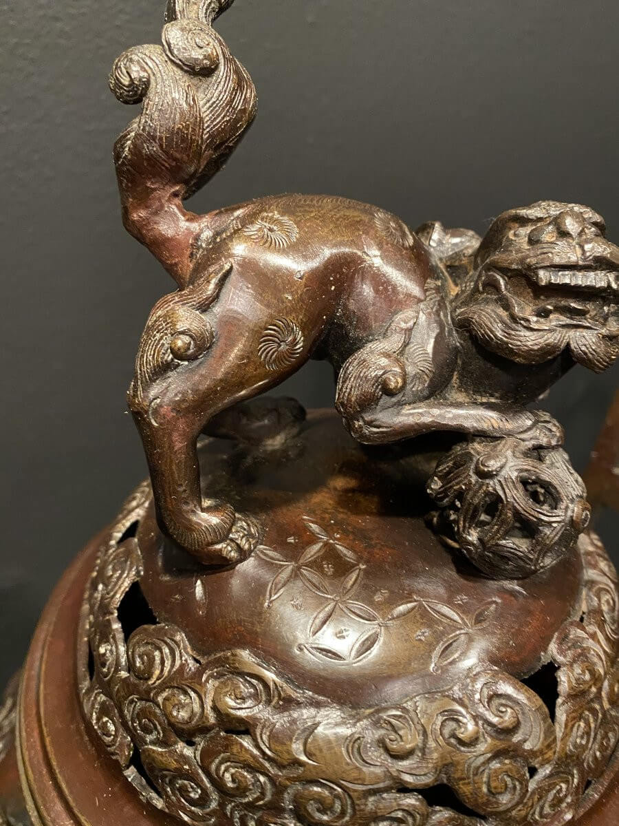Brule parfum en bronze à patine brune-rouge, à décor de tête d'éléphant .Couvercle ajouré surmonté d'un chien de fô .A noter : une soudure à la queue .Largeur : 27 cmProfondeur : 23 cmHauteur : 52 cm