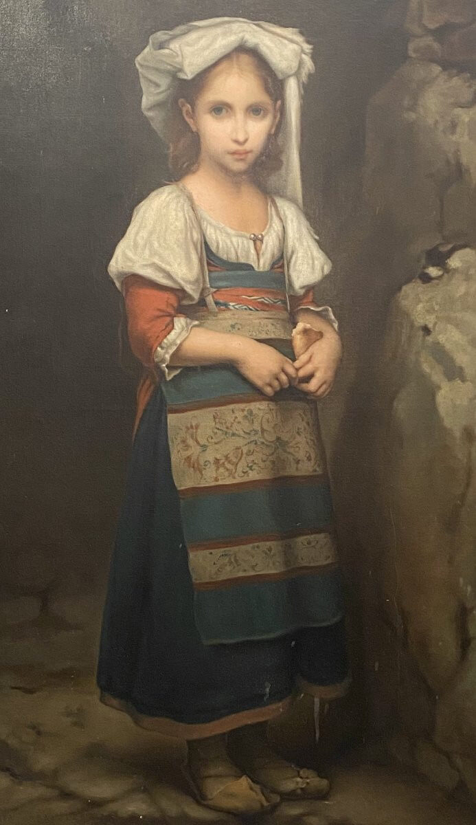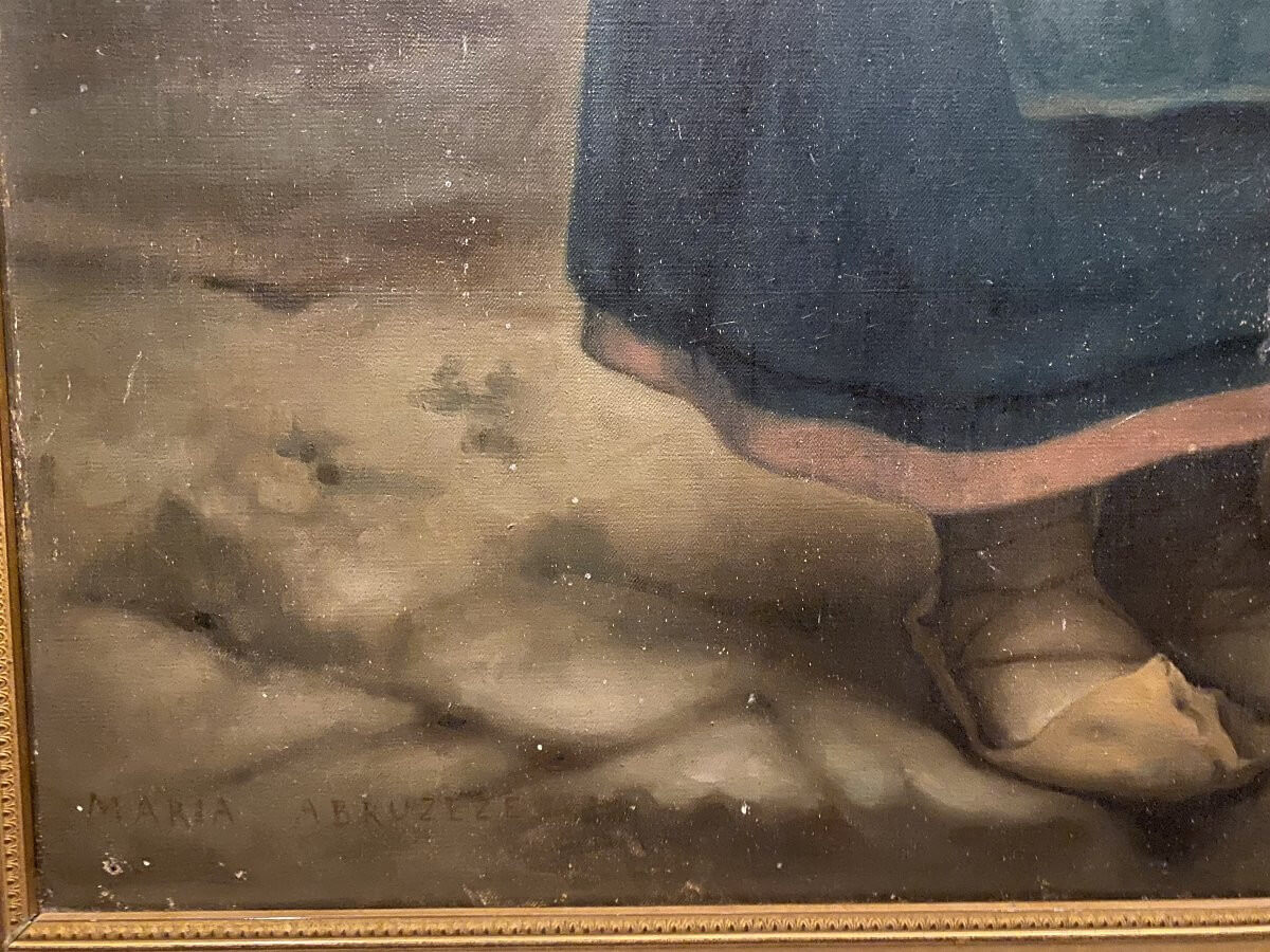 Portrait de Maria Pasqua,signé de Marie Abruzeze.Cadre récent de 132 cm x 84 cmPeinture, huile sur toile de 119 cm x 72 cm.Peinture en bon état avec quec taches dans le vernis.
