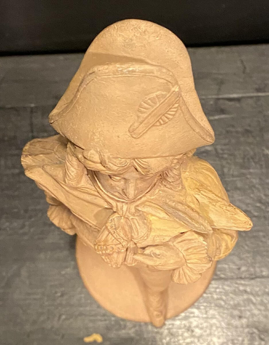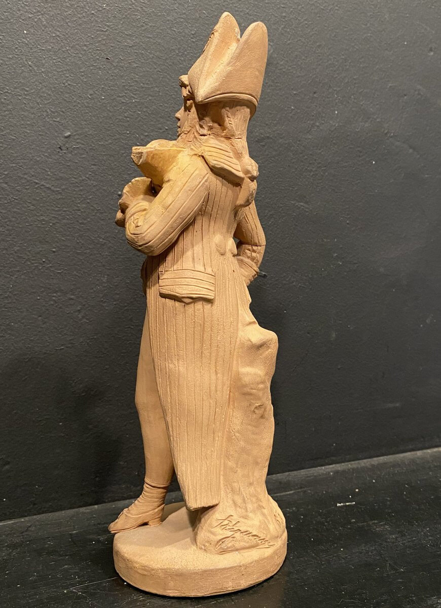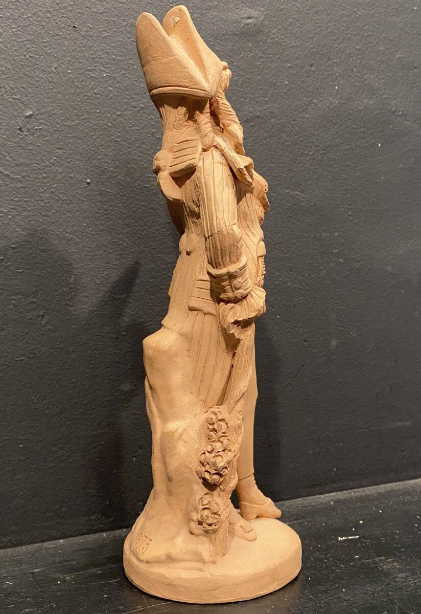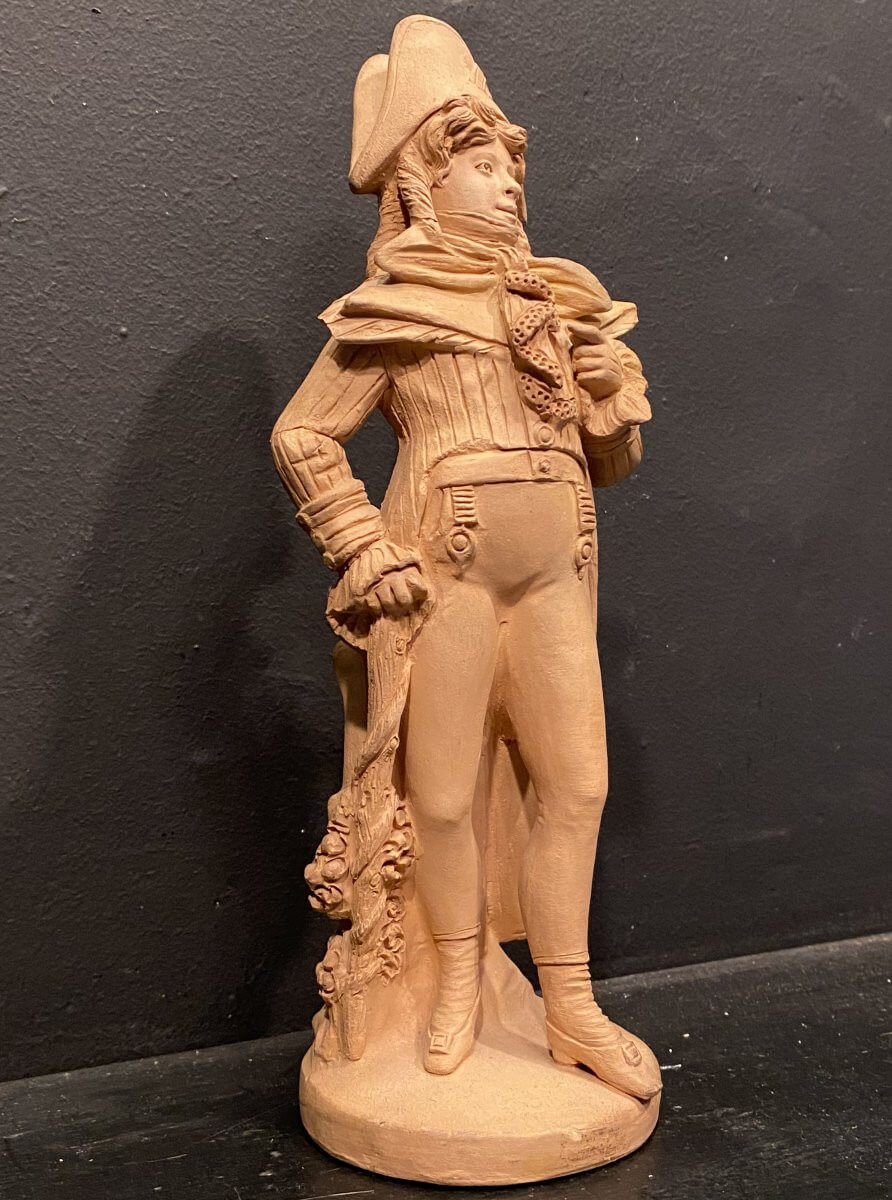 Statuette en terre cuite datant de la fin du XIX° ou du début du XX° représentant un incroyable. Les Incroyables et Merveilleuses étaient des figures très populaires dans l’iconographie post-Terreur (Directoire, vers 1795-1799) et ont été énormément représentés au XIXᵉ siècle, notamment en statuettes décoratives.Plusieur détails sont carectéristiques : le bicorne très haut porté de façon théatrale.la cravate exagérée nouée haut sur le coula taille marquée, pantalon ajusté, attitude maniéréela canne la pose affectée, presque caricaturale