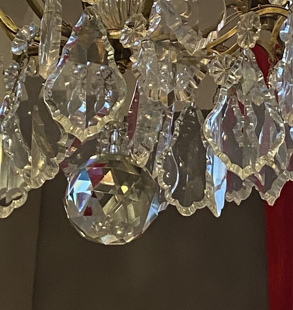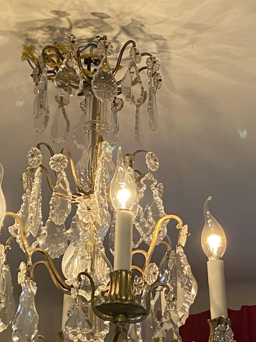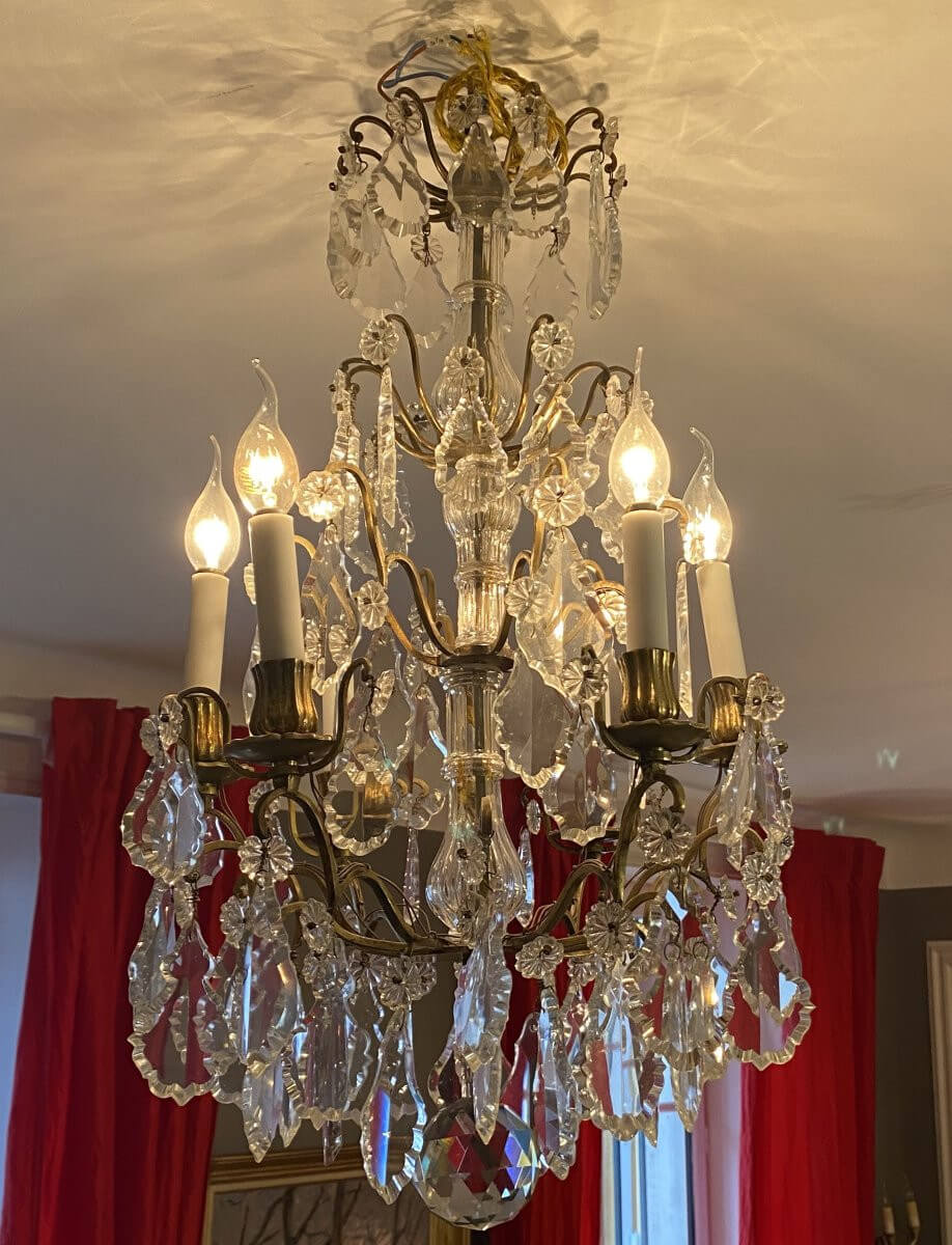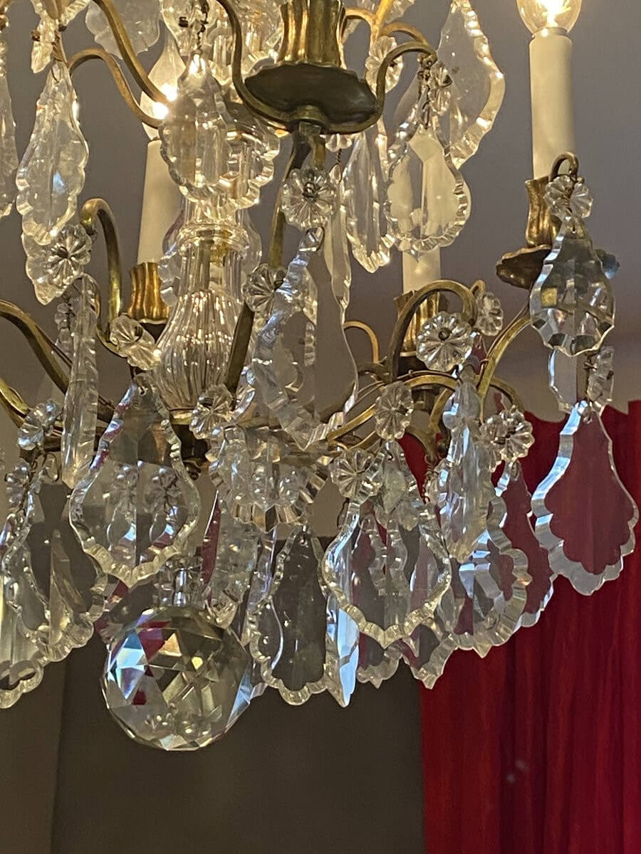 Lustre en cristal et bronze de 45 cm de diamètre et 72 cm de haut. La hauteur peut etre augmentée par une chaine.Eléctrification en bon état .