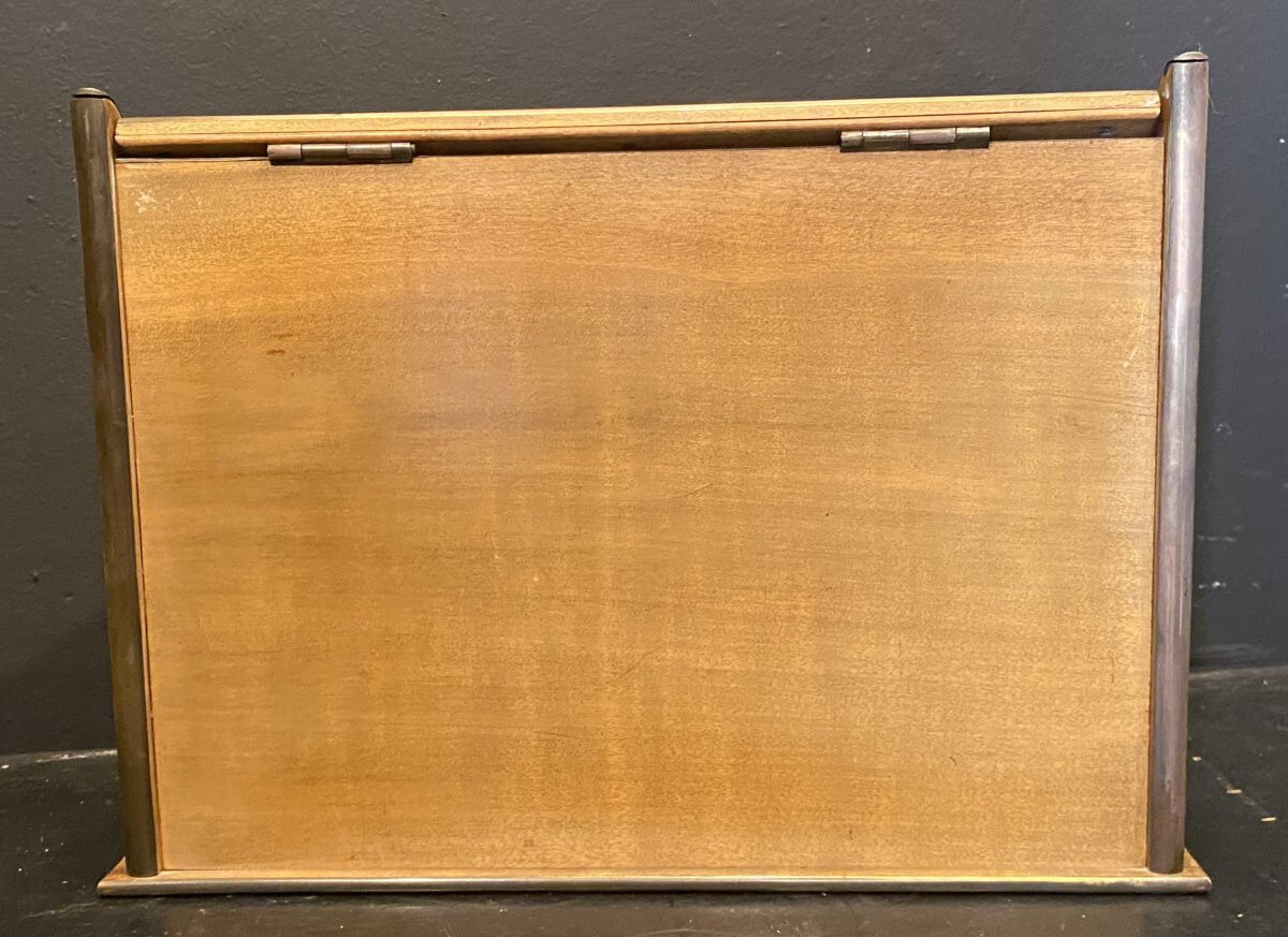 Boite à courriers, en acajou et filets de laiton, orné de gravures colorées.A noter : un angle d'une gravure cassé dans l'angle, voir photos.31 cm x 12,5 cm pour une hauteur de 23 cm