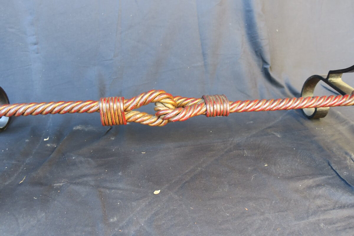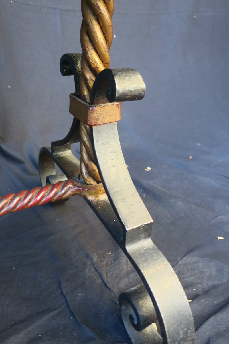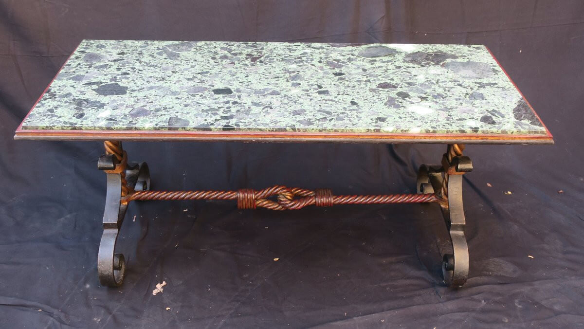 Table basse art déco en fer forgé doré sur fon rouge et noir avec un joli travail de cordage noué en entretoise .A noter : un éclat recollé sur le marbre, voir photos.120 cm x 50 cm pour une hauteur de 55,5 cm