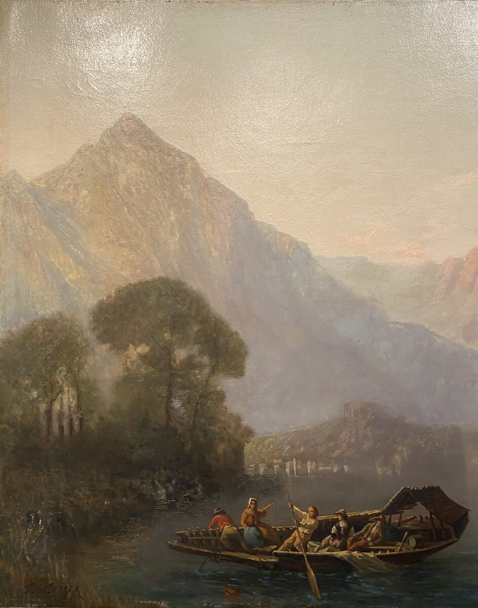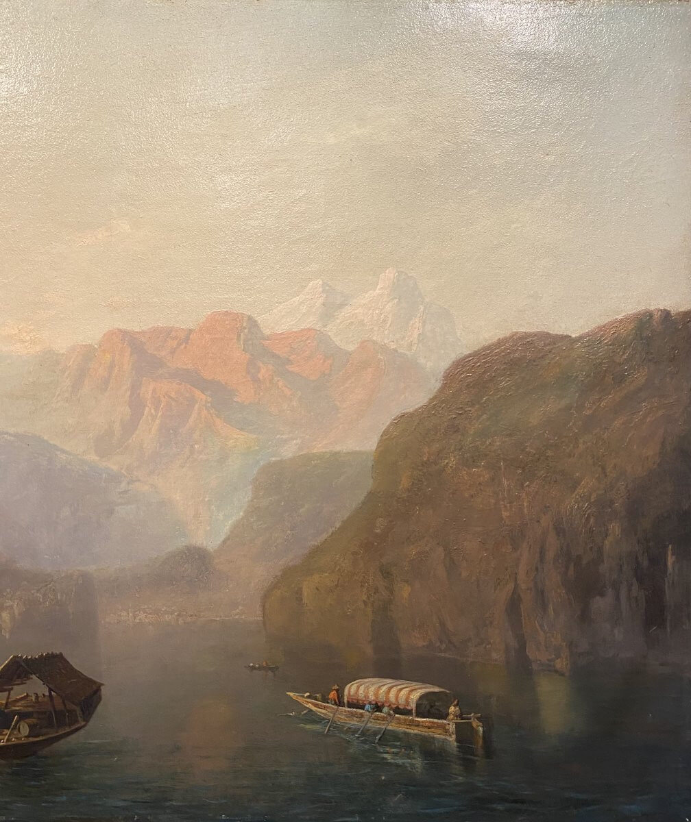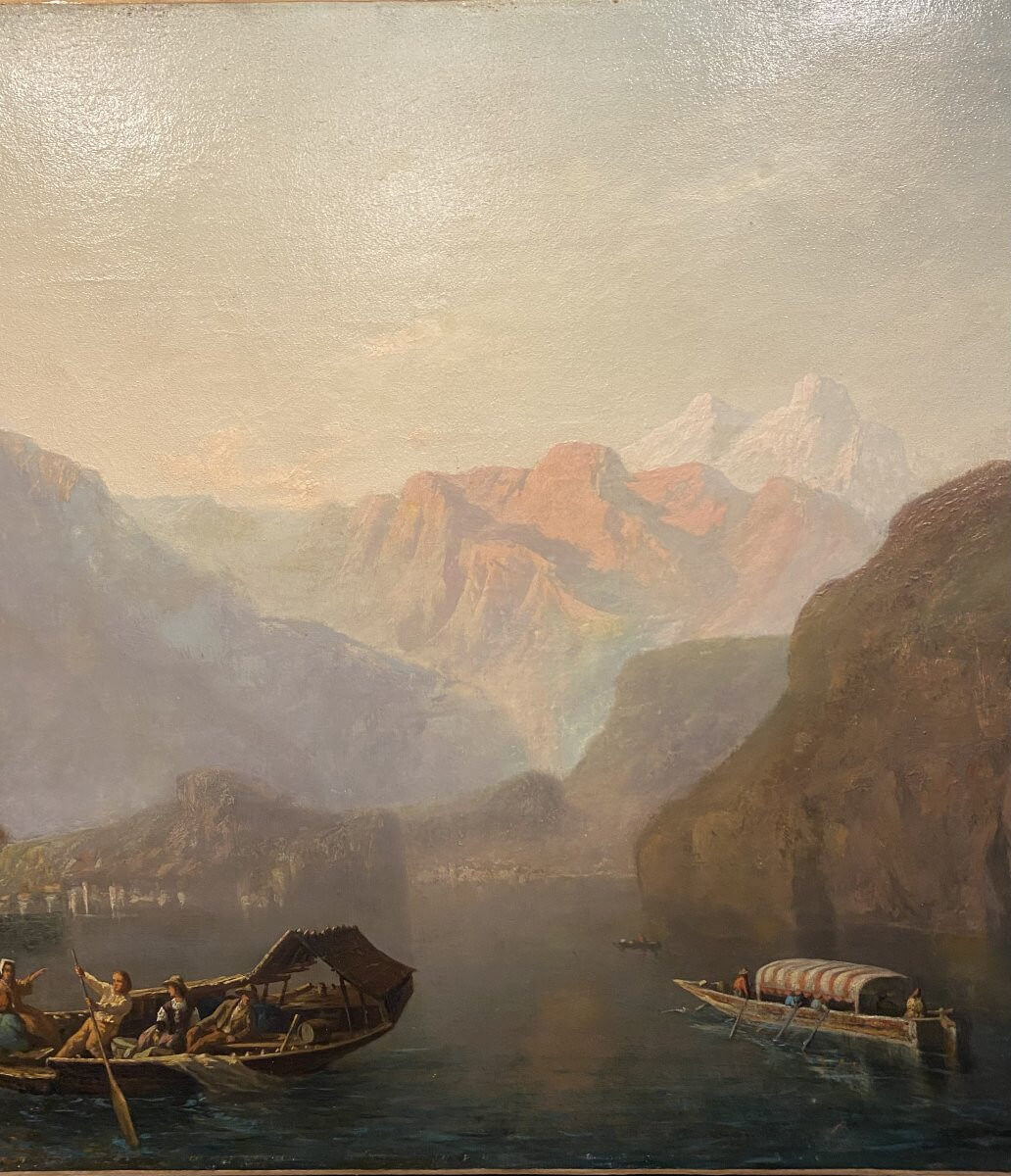 Huile sur toile représentant un lac de montagne animé de barques .Peinture signée Carrer, école anglaise .72,5 cm x 107,5 cm