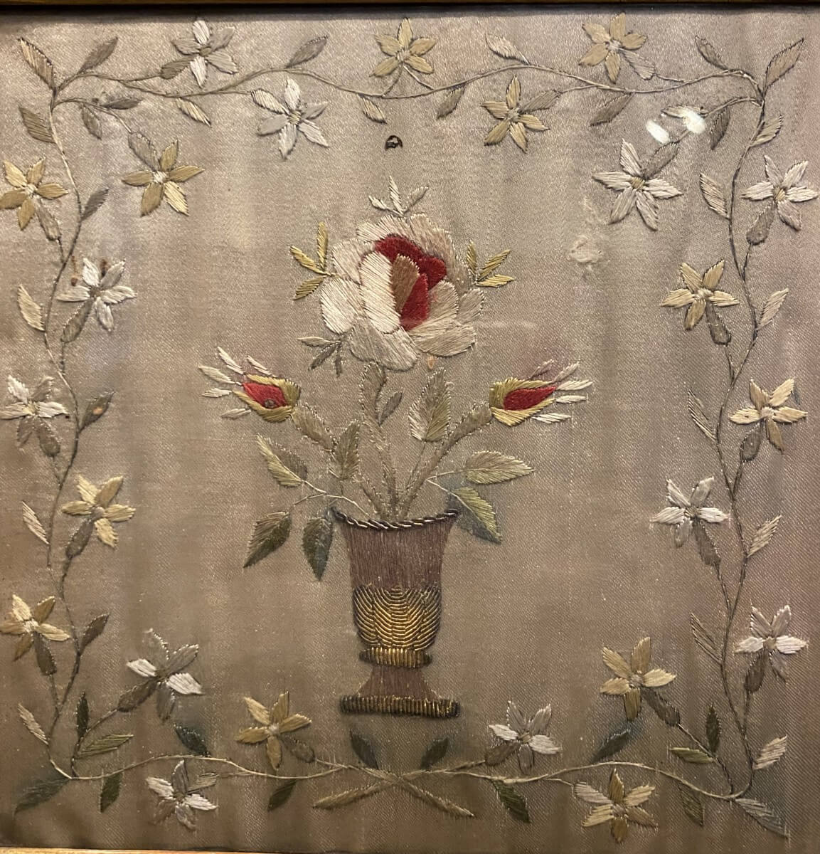 Petit bouquet brodé sur de la soie dans son cadre doré .A noter : petit manque dans l'angle droit en bas du cadre.21 cm x 21 cm