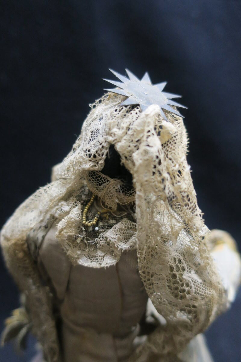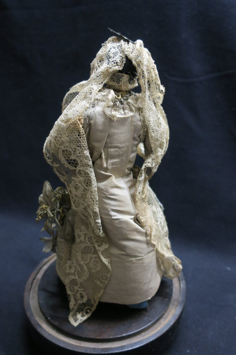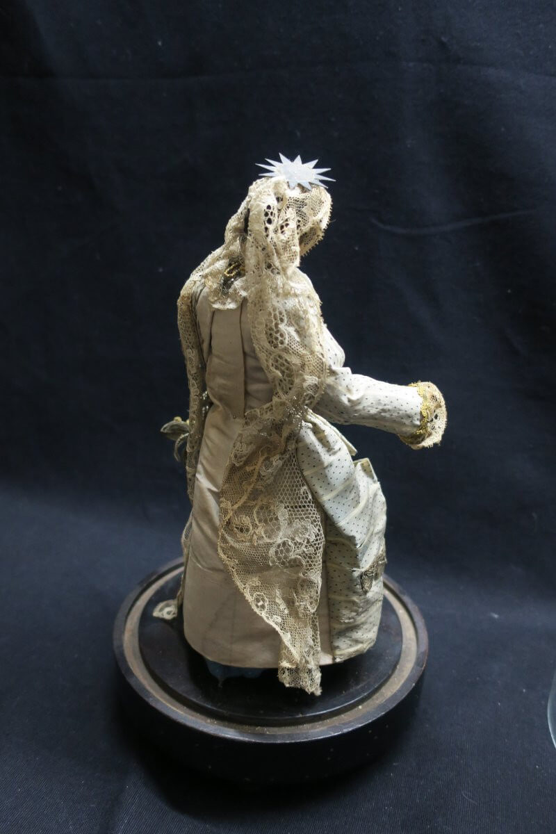 Vierge habillée en cire d'époque XVIII° avec ses vétements et bijoux d'origine .Montage sous globe XIX° .hauteur de la Vierge : 26 cm .Dimensions du globe :diamètre : 18 cmHauteur : 41 cm