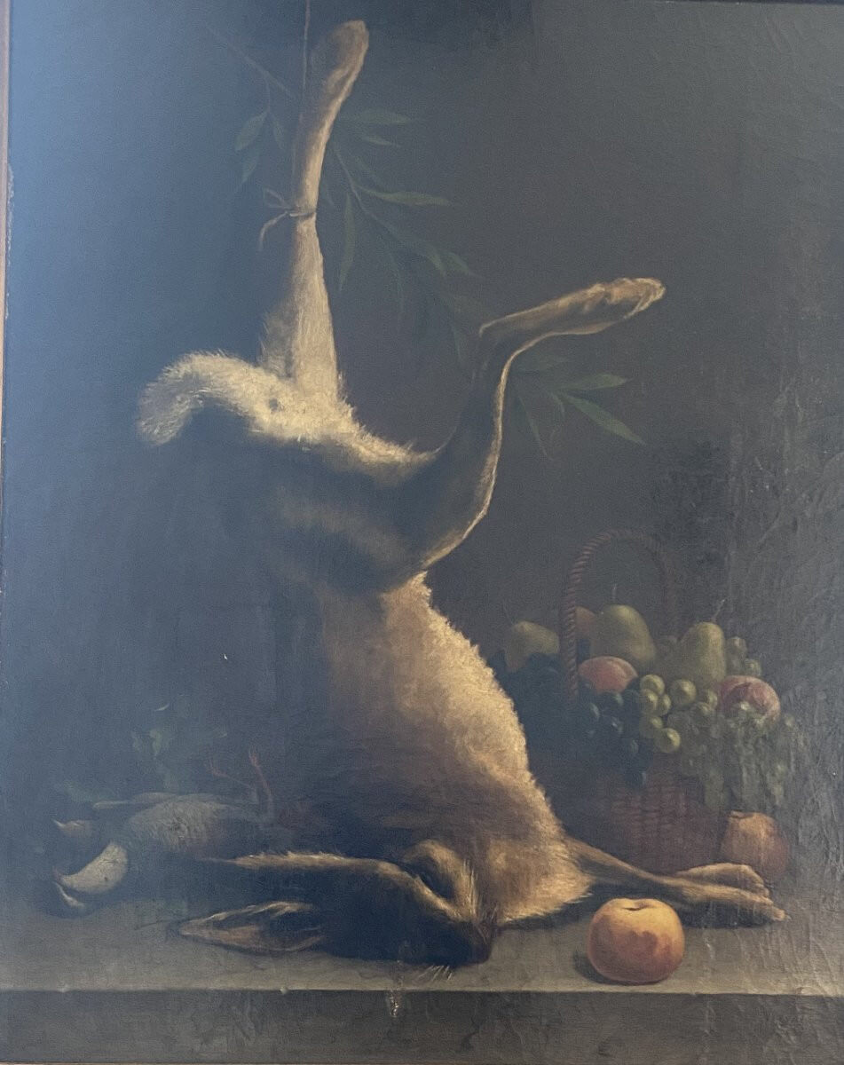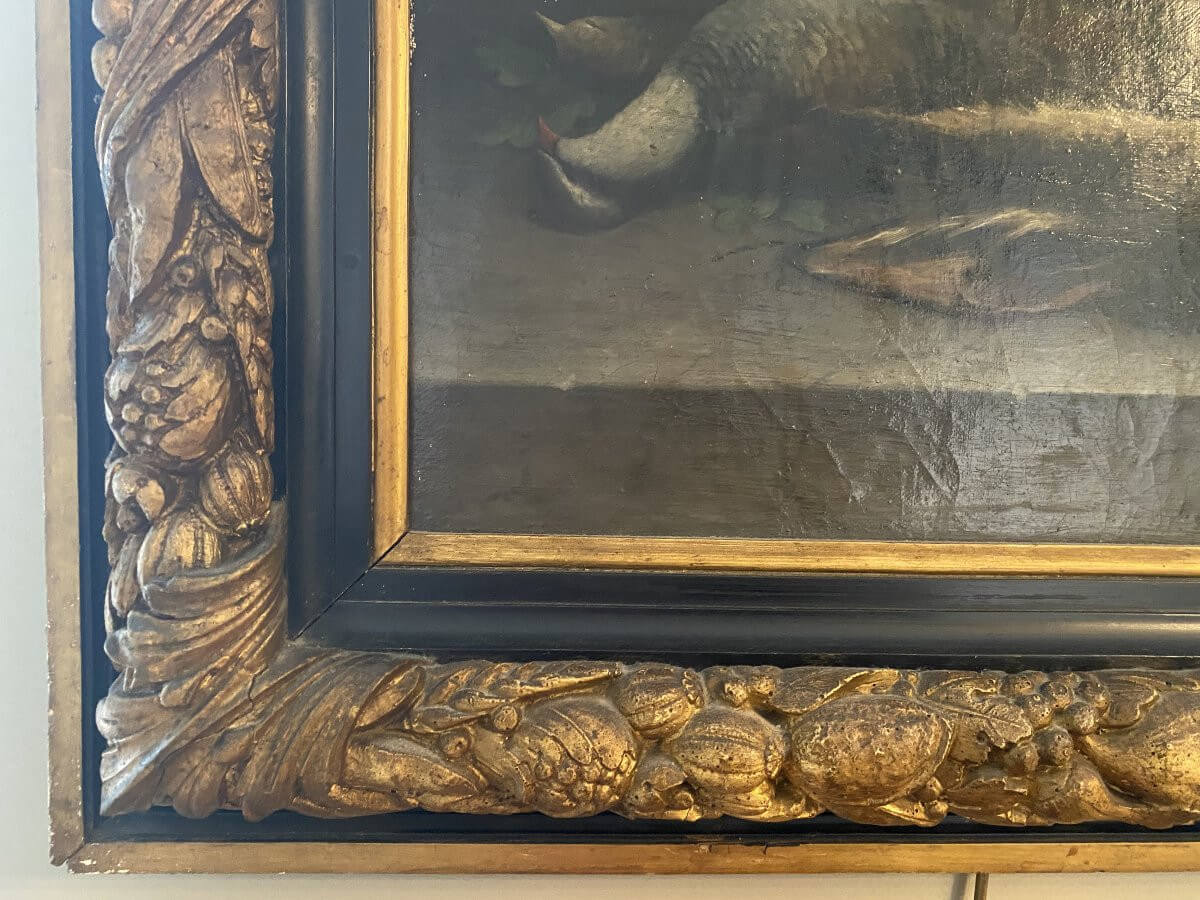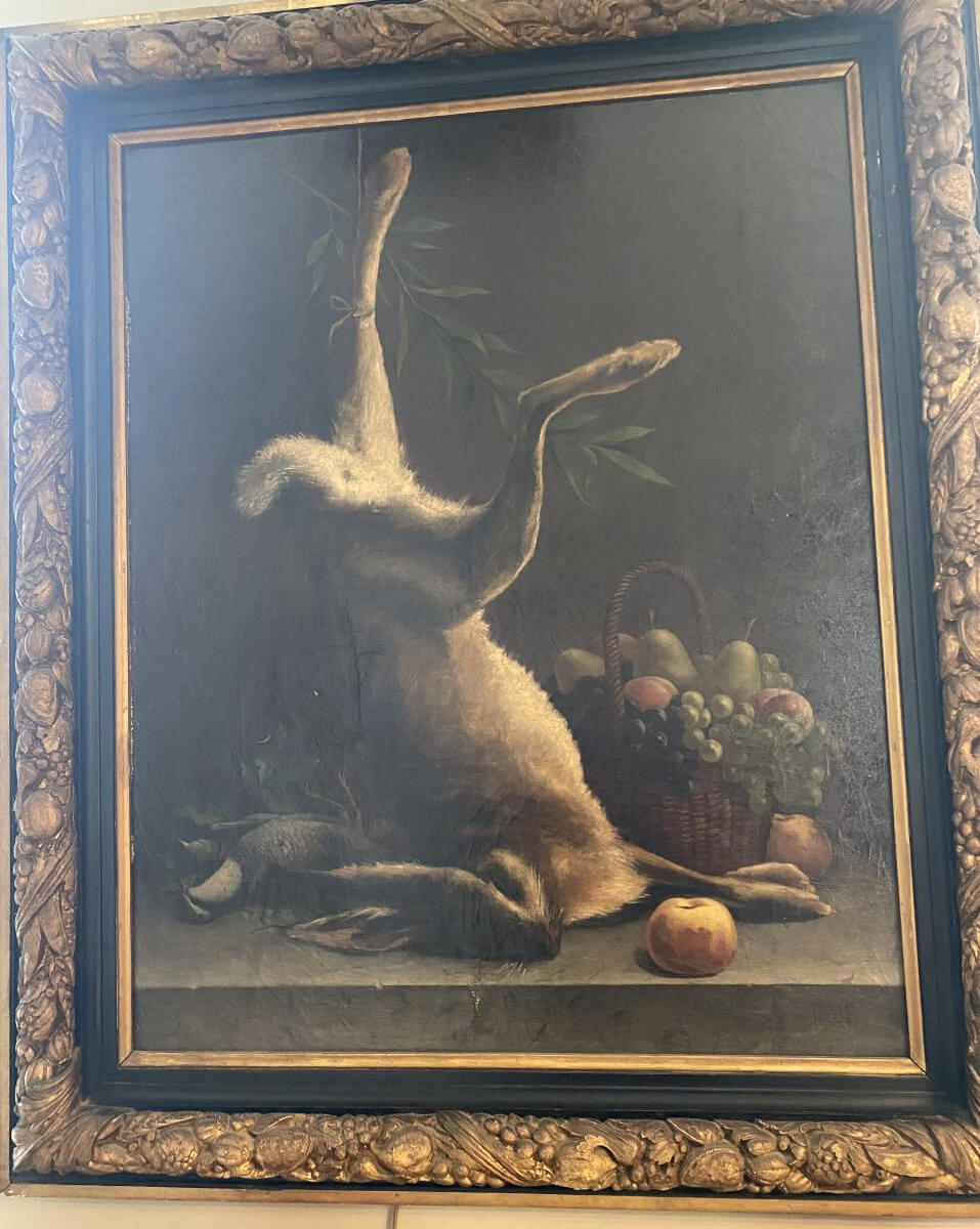Nature morte avec son beau cadre .Peinture représentant un lapin suspendu par une patte avec une belle corbeille de fruits .Ce tableau a été réentoilé anciennement en raison de déchirures à peine visible maintenant .Dimension du cadre : 101 cm x 85 cmDimension de la toile : 93 cm x 72 cm