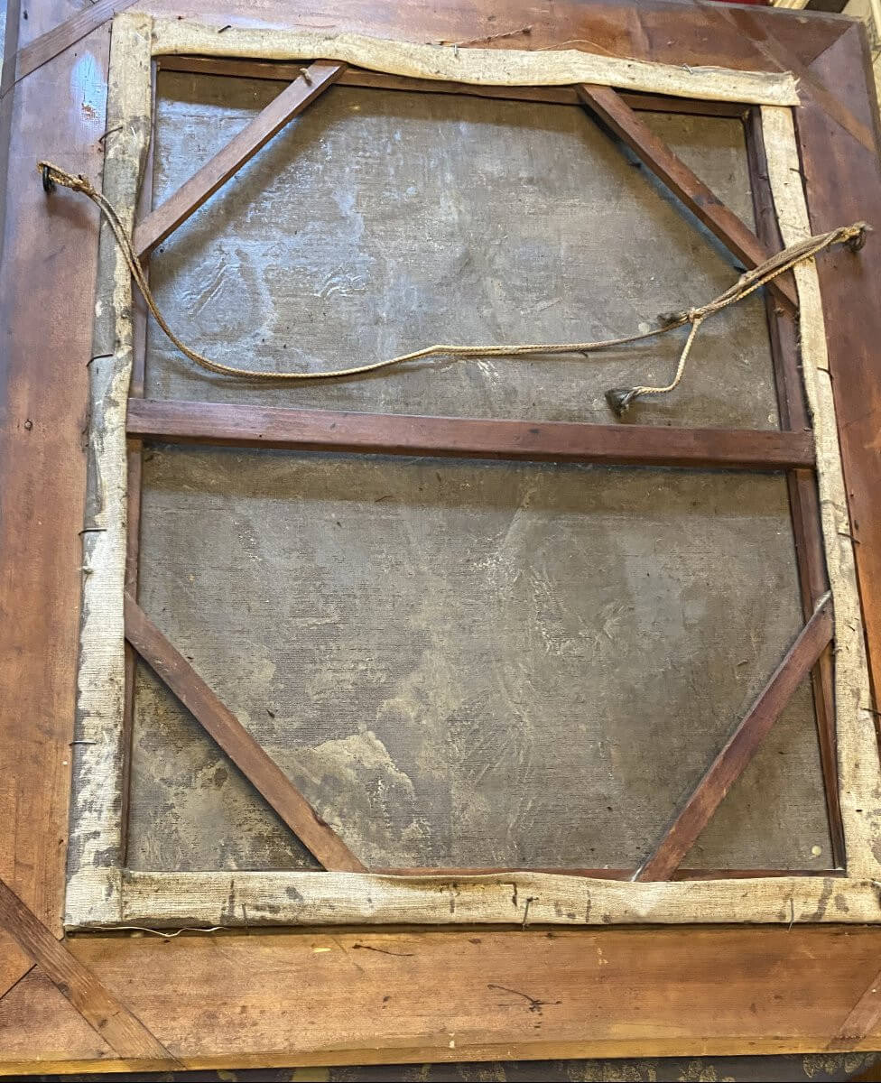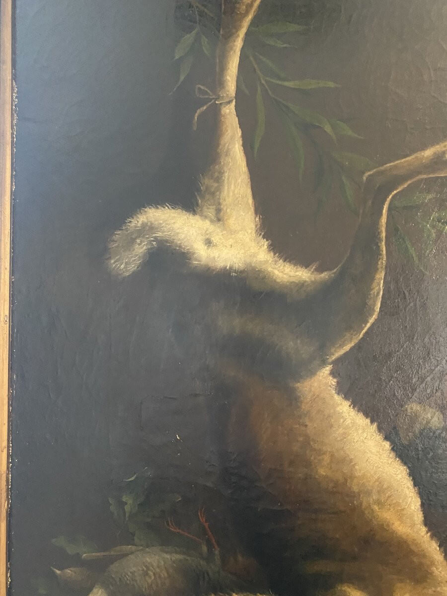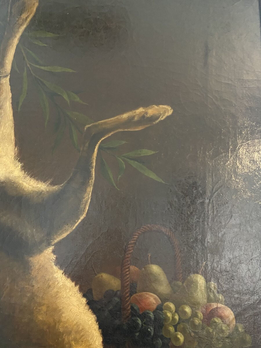 Nature morte avec son beau cadre .Peinture représentant un lapin suspendu par une patte avec une belle corbeille de fruits .Ce tableau a été réentoilé anciennement en raison de déchirures à peine visible maintenant .Dimension du cadre : 101 cm x 85 cmDimension de la toile : 93 cm x 72 cm